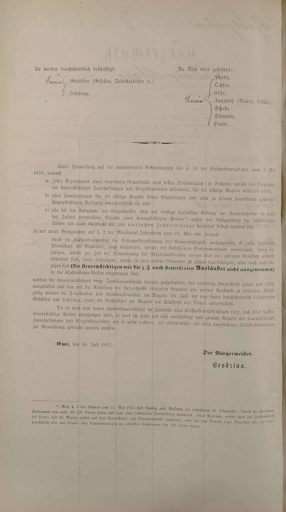 Personenstandsaufnahme zur Klassensteuerrolle für 1873