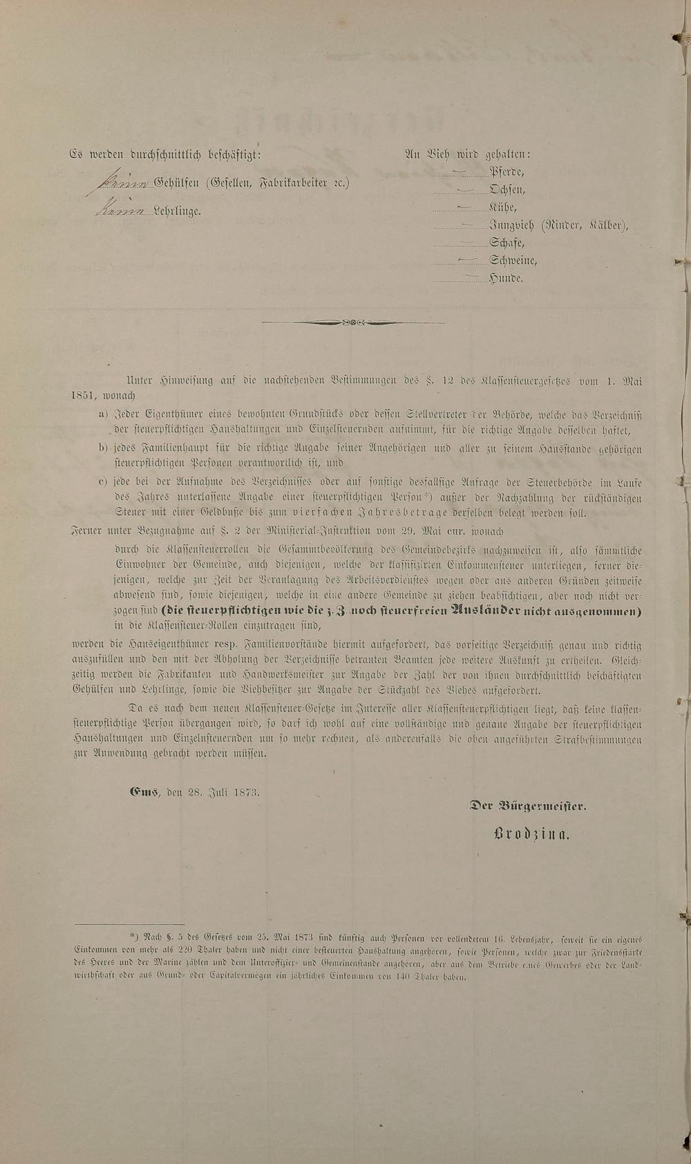 Personenstandsaufnahme zur Klassensteuerrolle für 1873