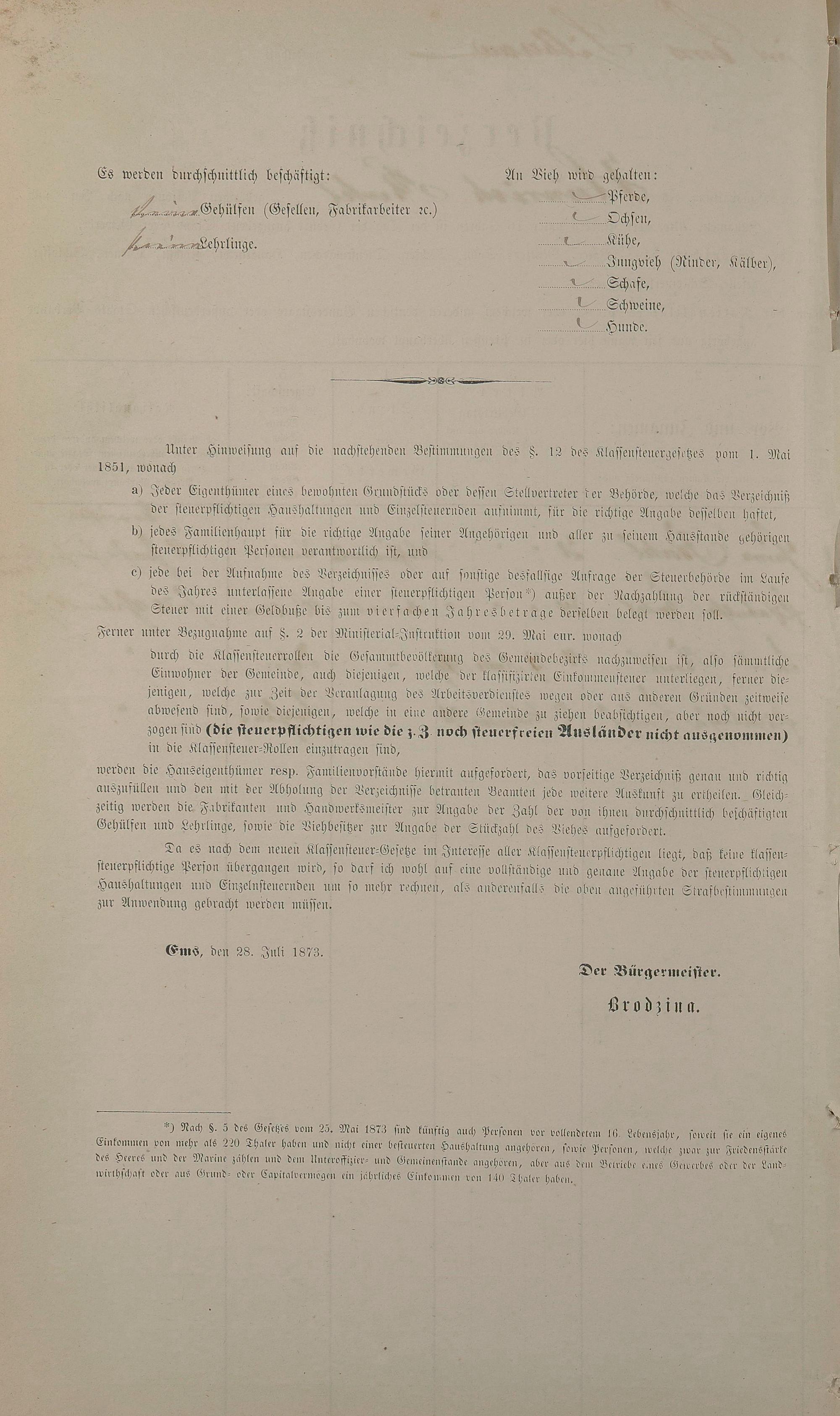 Personenstandsaufnahme zur Klassensteuerrolle für 1873
