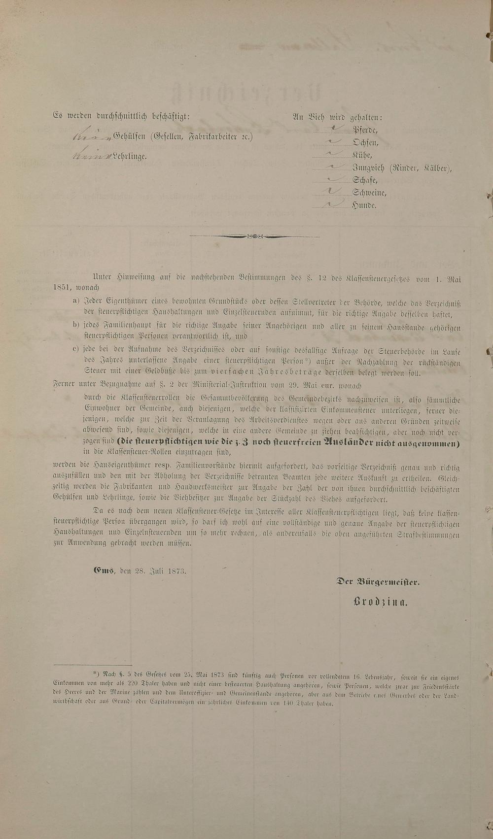 Personenstandsaufnahme zur Klassensteuerrolle für 1873
