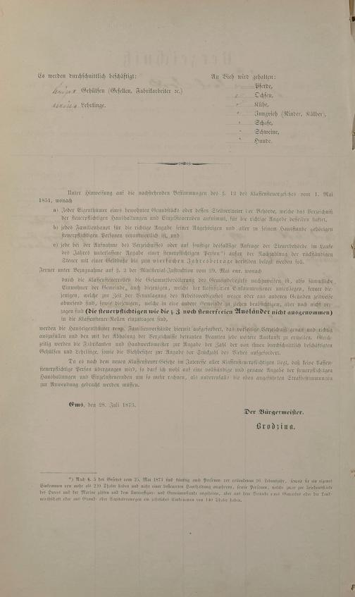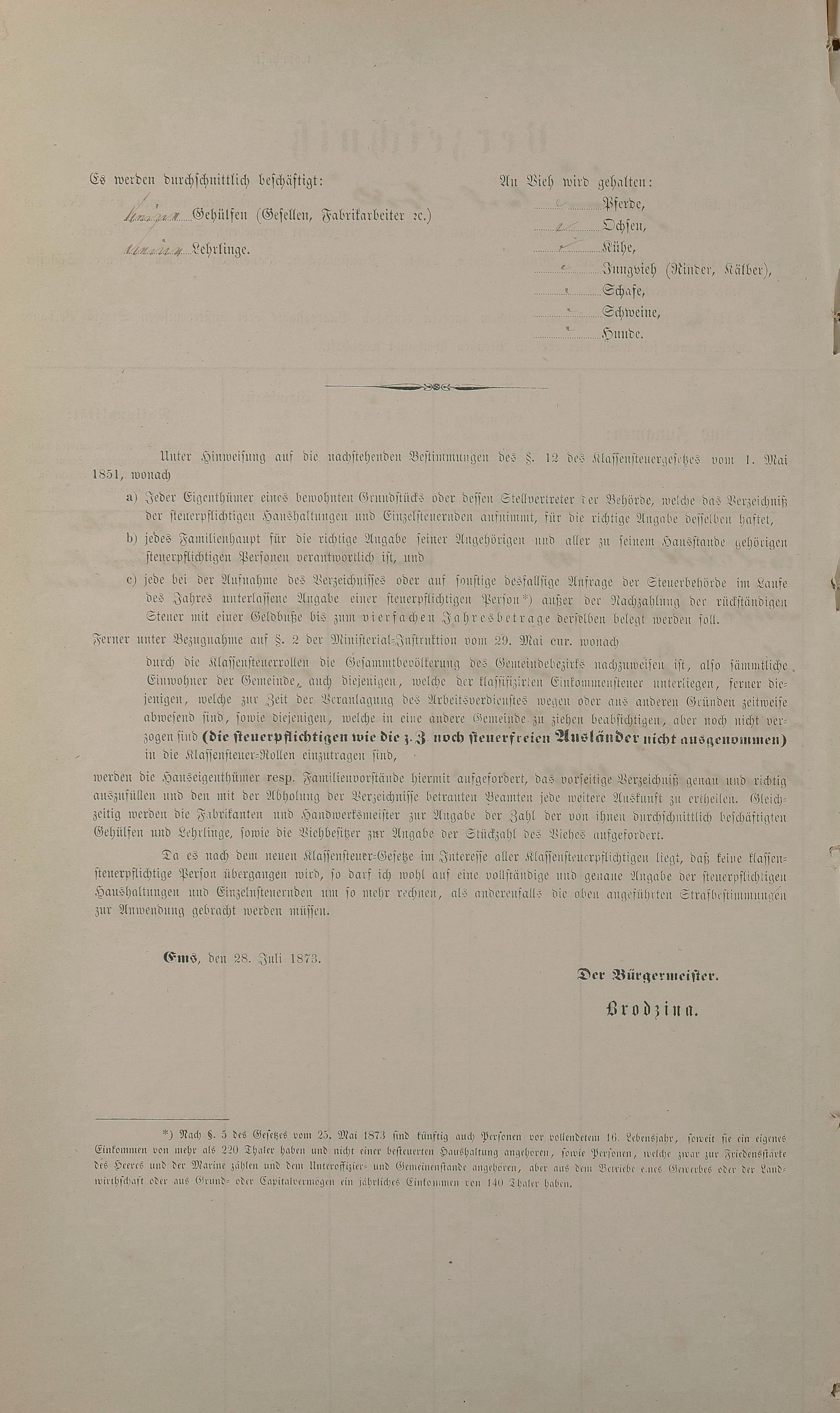 Personenstandsaufnahme zur Klassensteuerrolle für 1873