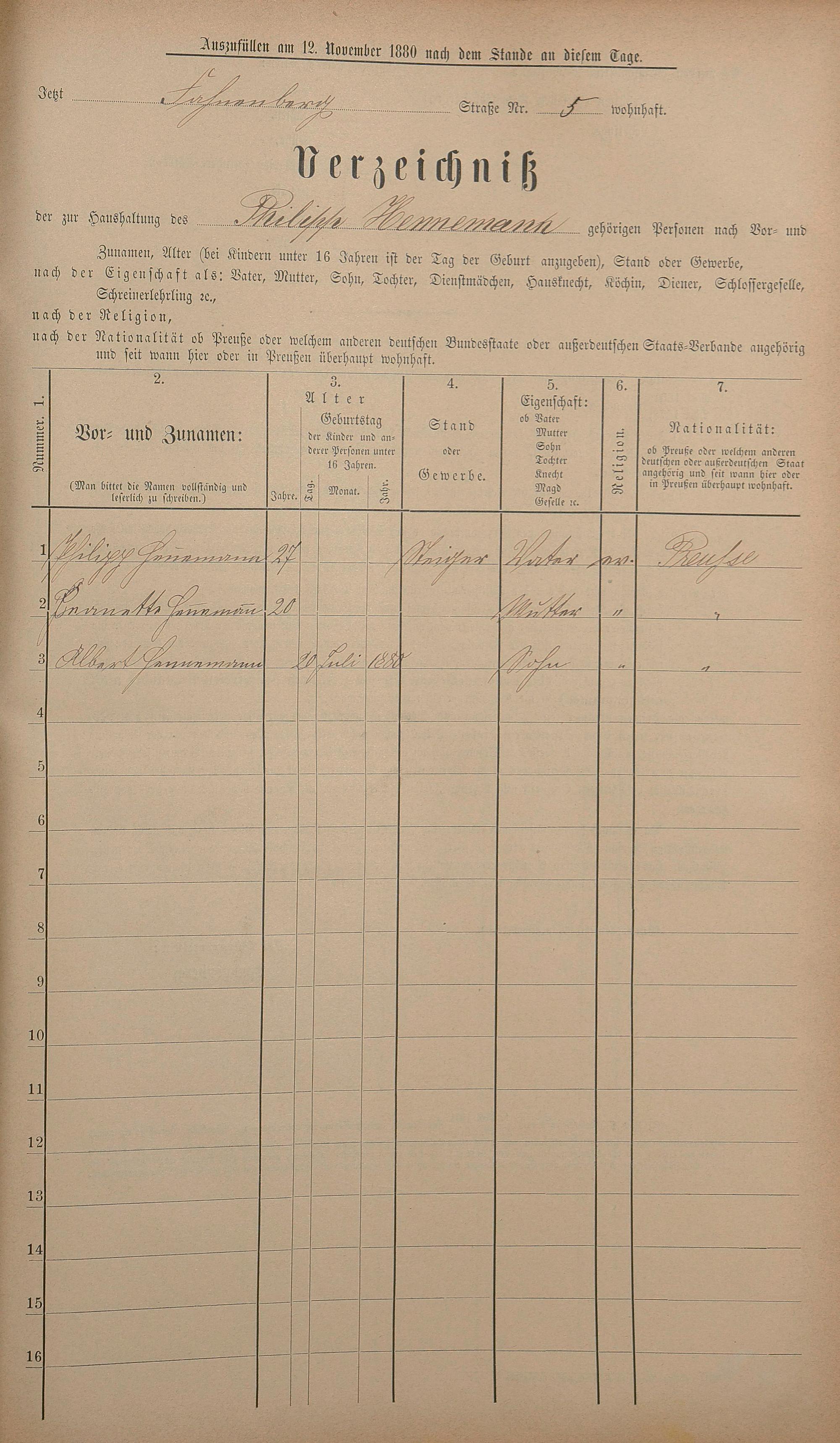 Personenstandsaufnahme zur Klassensteuerrolle für 1880