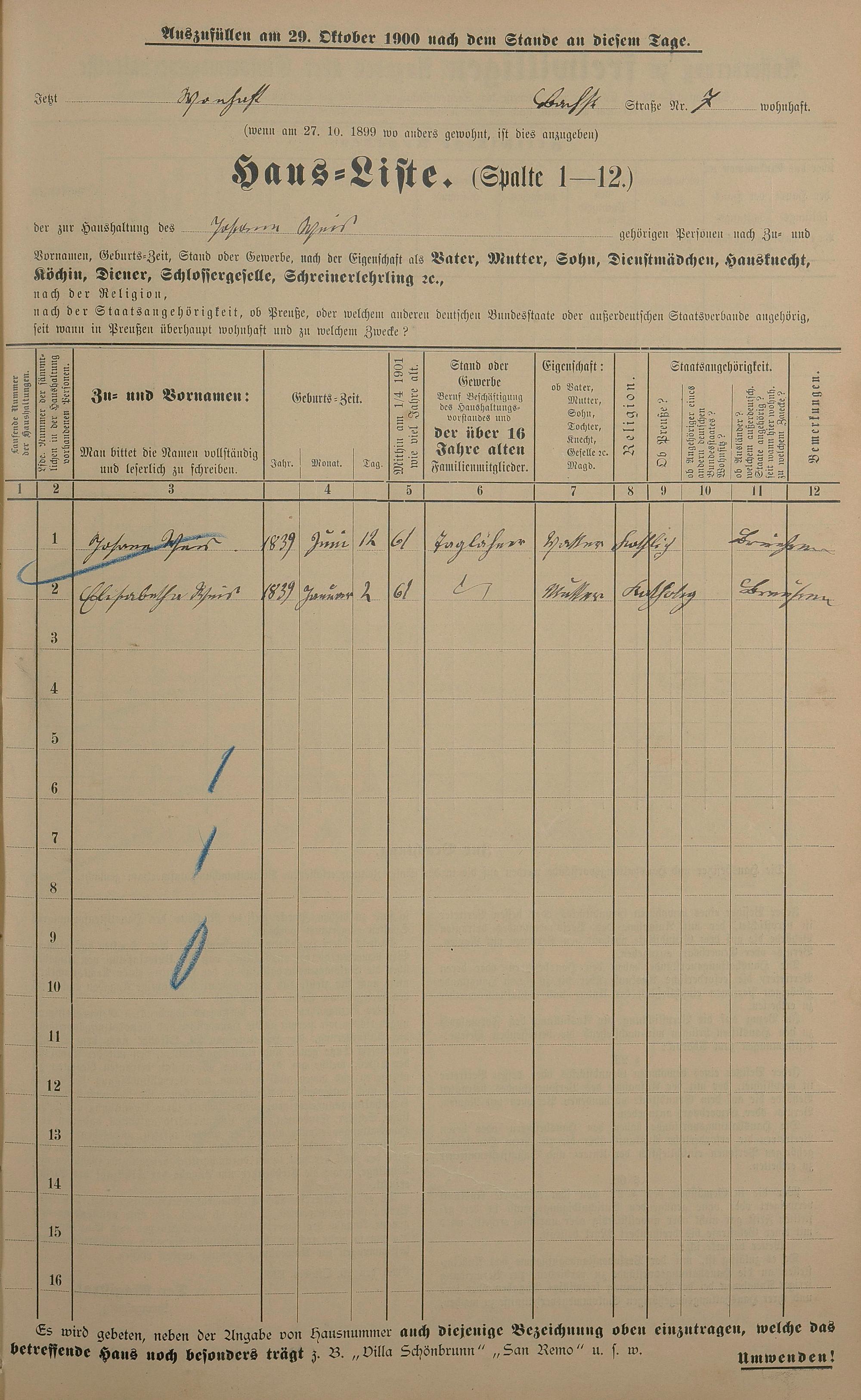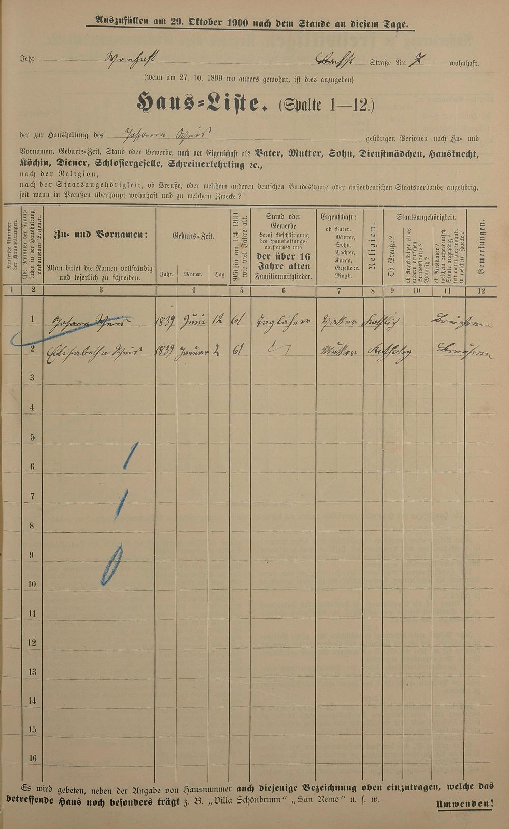 Personenstandsaufnahme zur Klassensteuerrolle für 1901