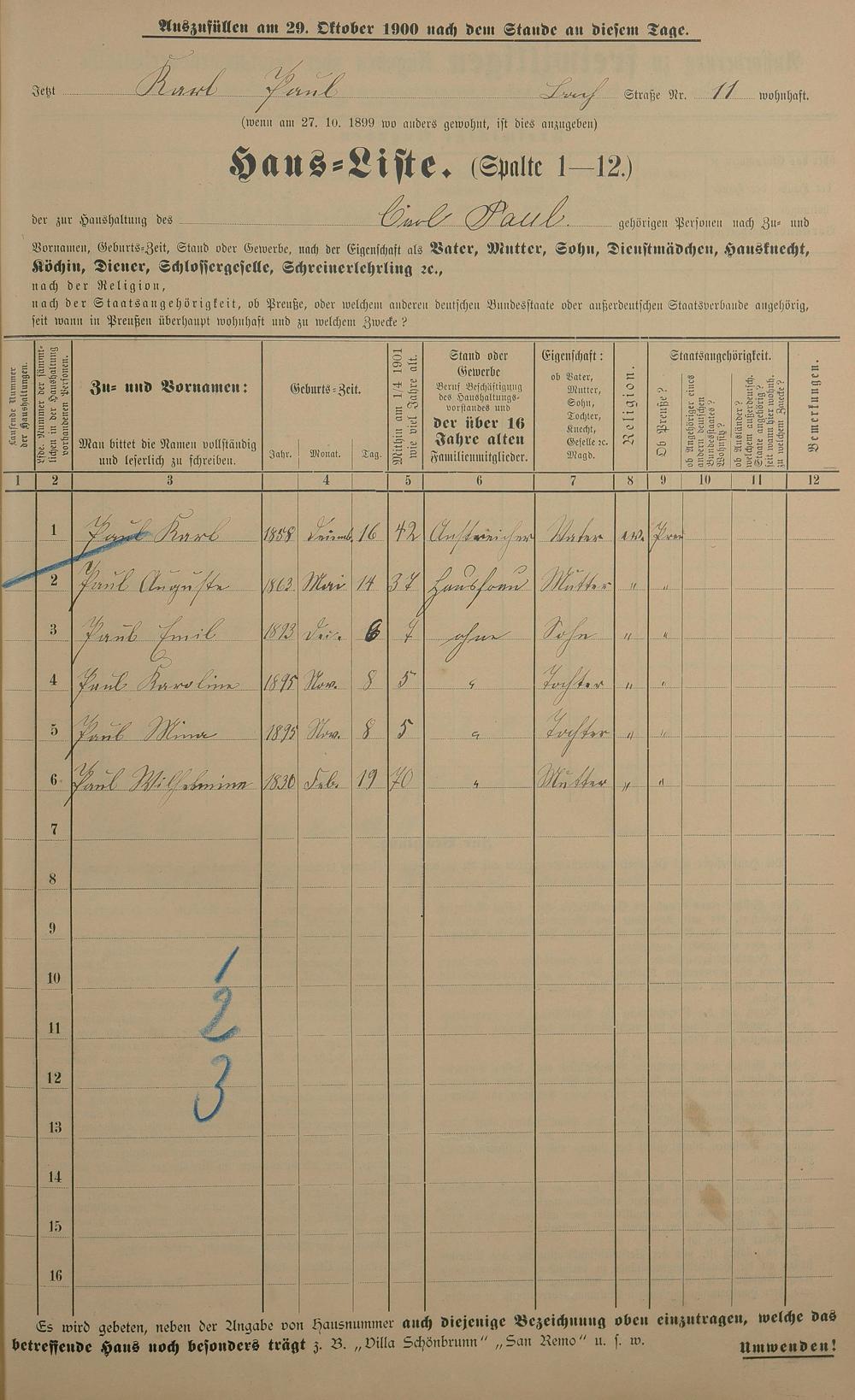 Personenstandsaufnahme zur Klassensteuerrolle für 1901