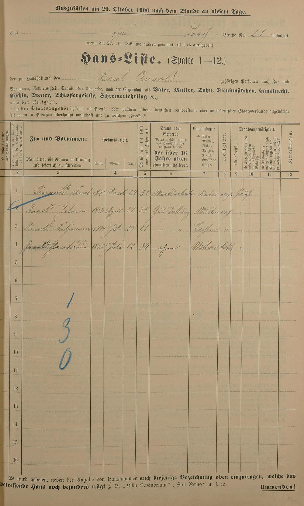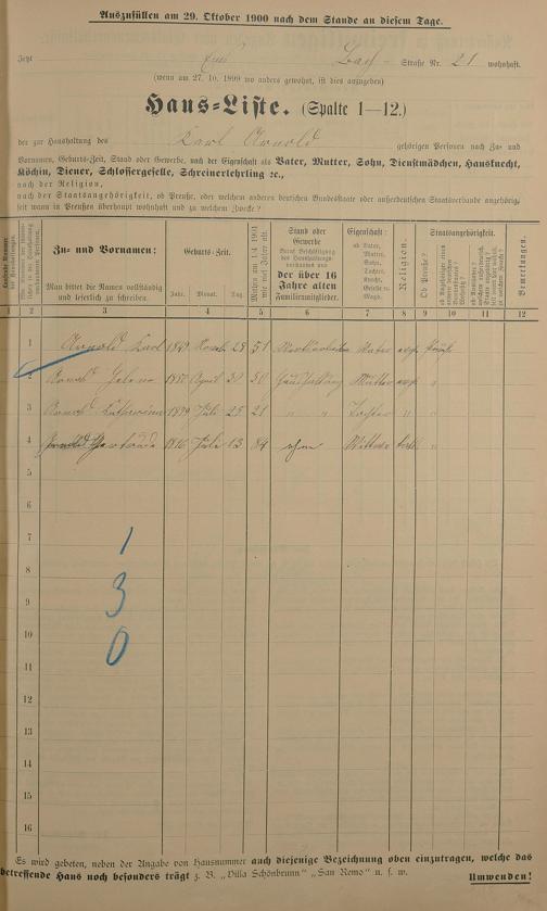 Personenstandsaufnahme zur Klassensteuerrolle für 1901