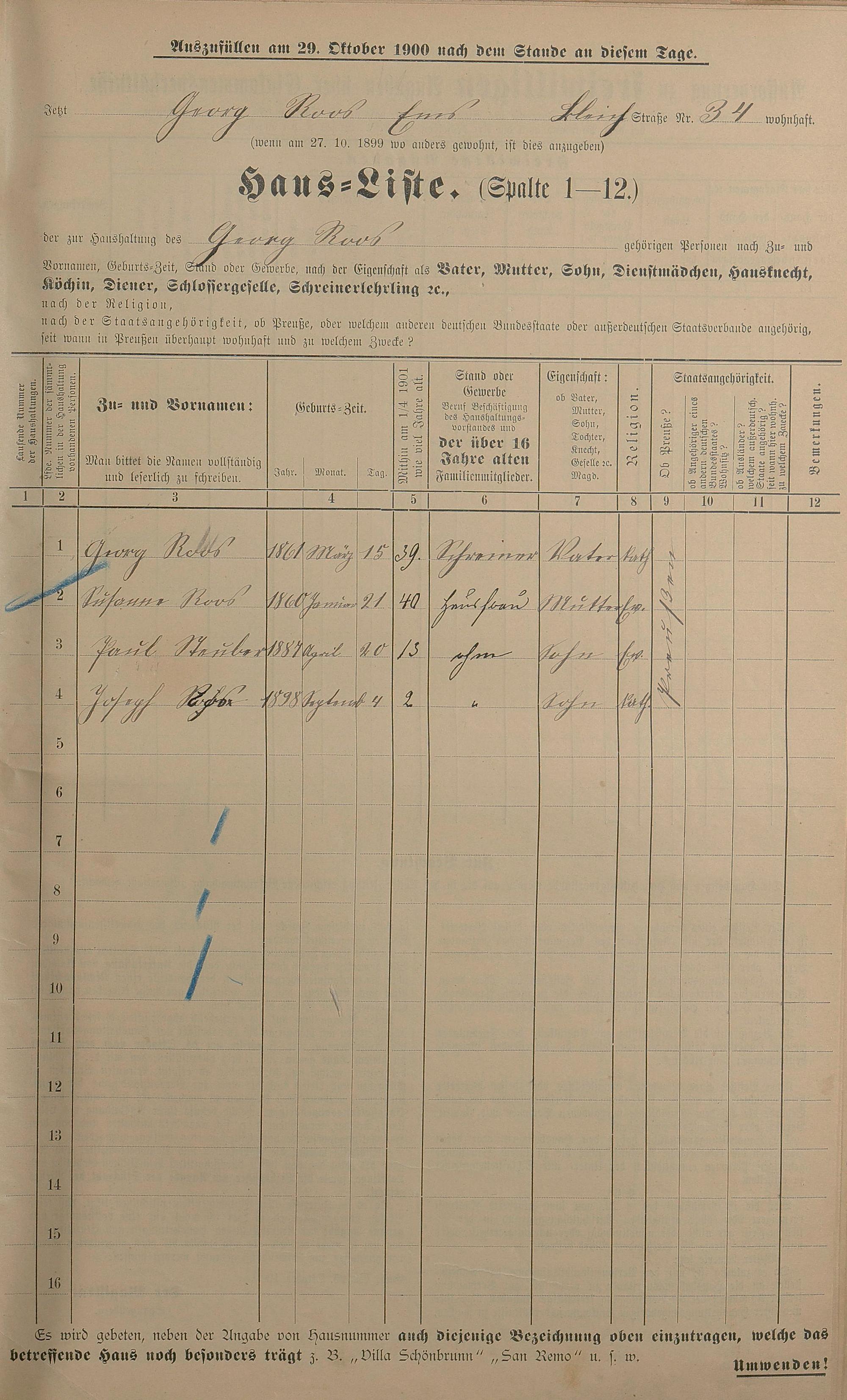 Personenstandsaufnahme zur Klassensteuerrolle für 1901