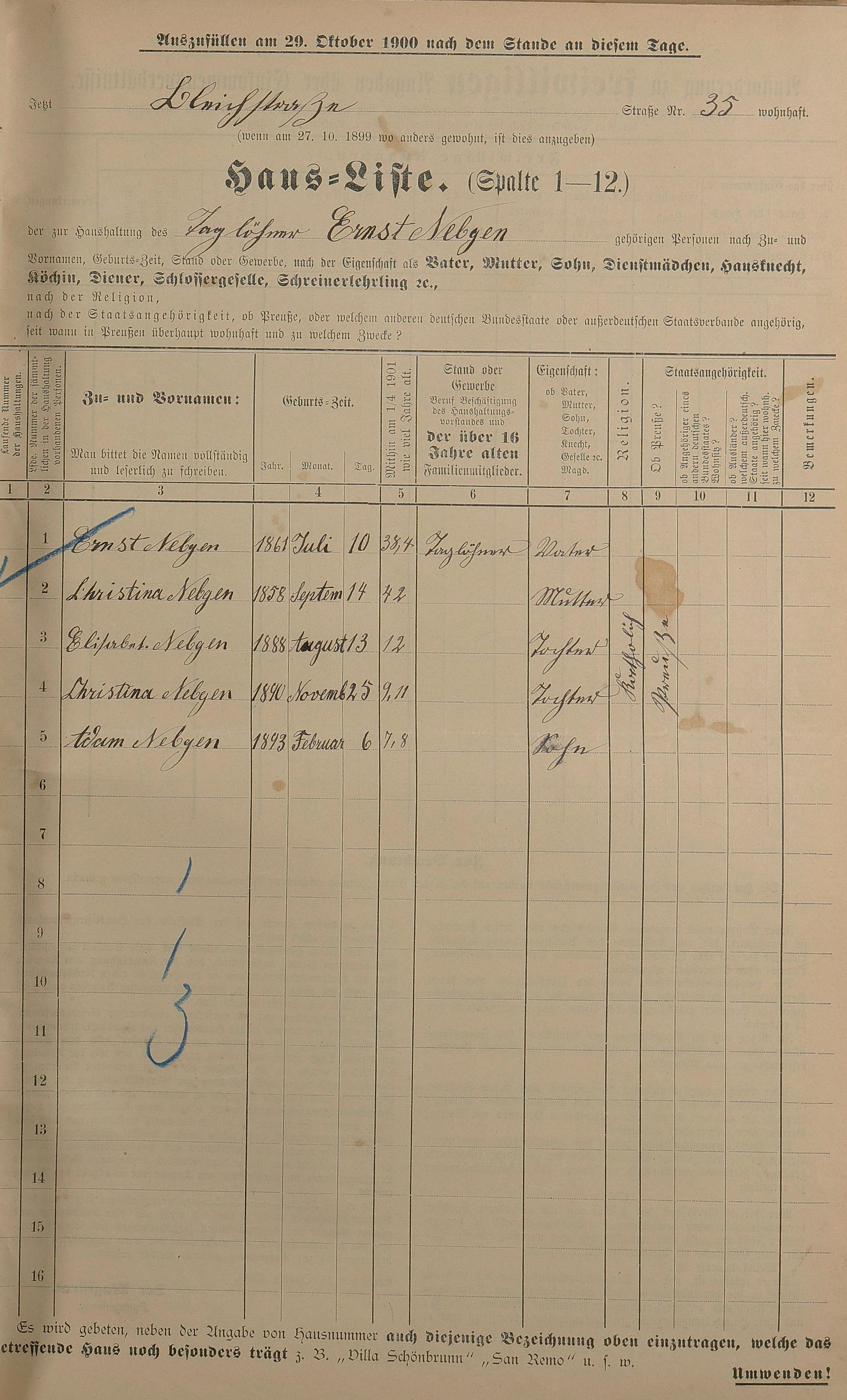 Personenstandsaufnahme zur Klassensteuerrolle für 1901