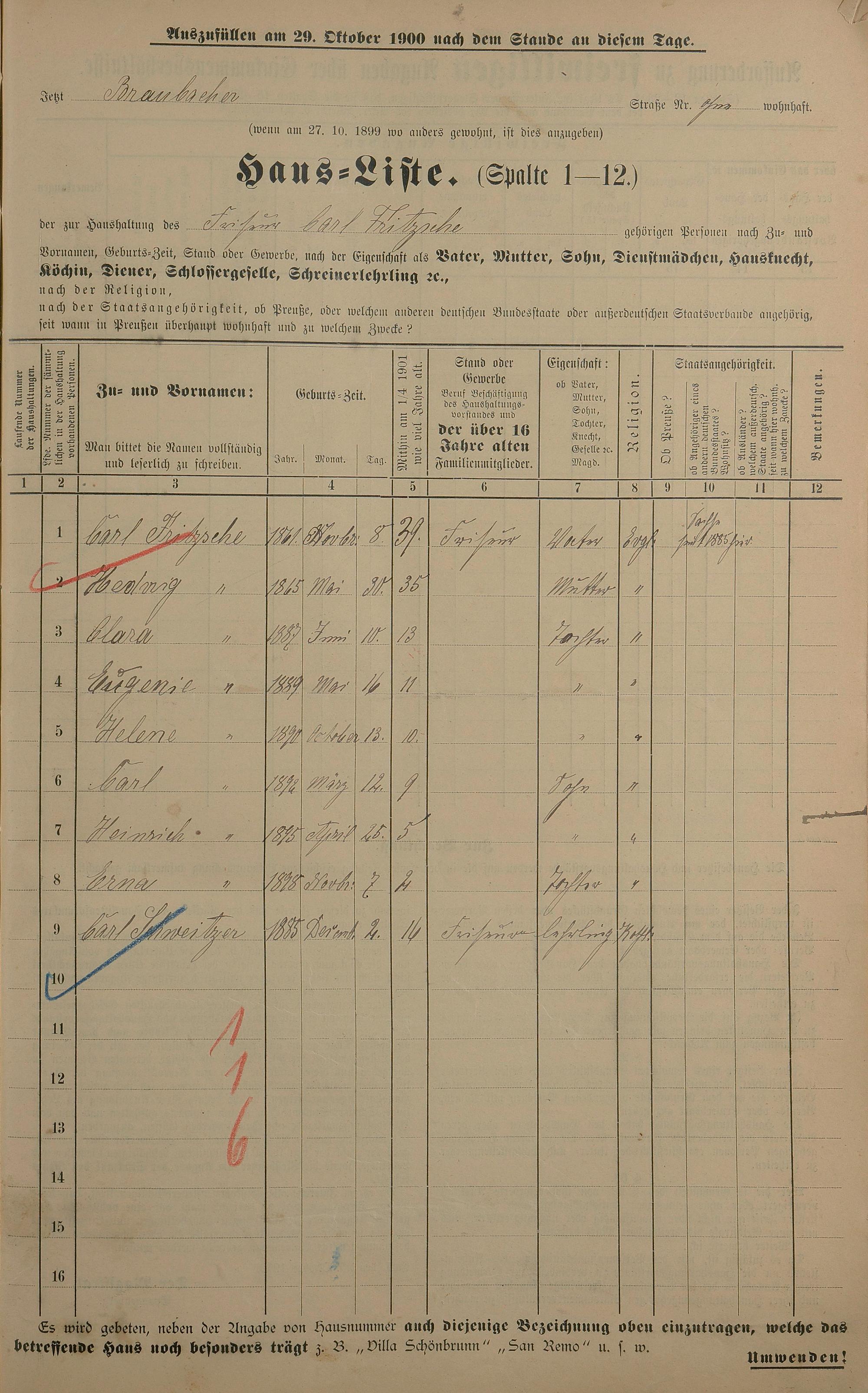 Personenstandsaufnahme zur Klassensteuerrolle für 1901