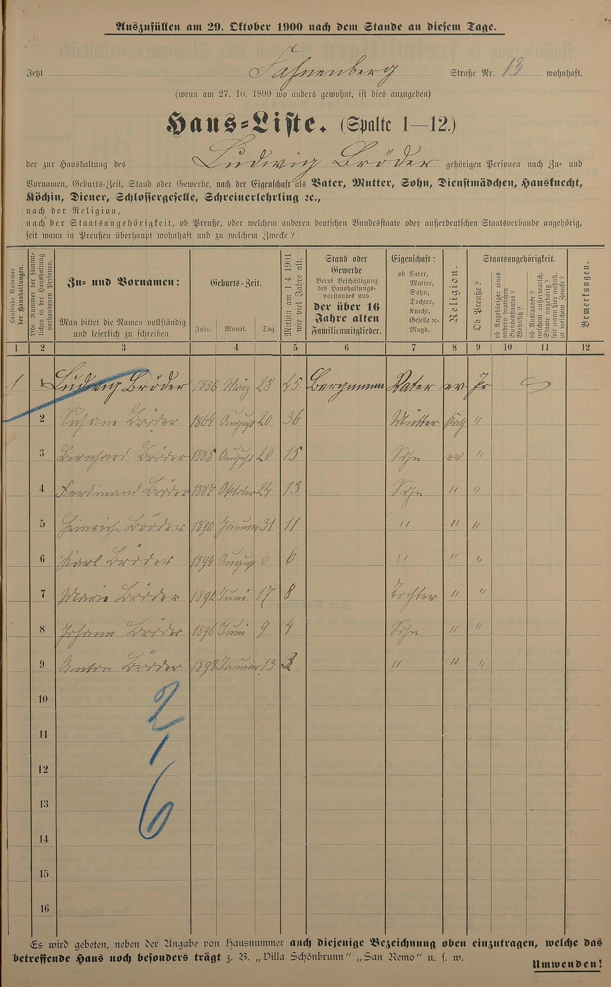 Personenstandsaufnahme zur Klassensteuerrolle für 1901