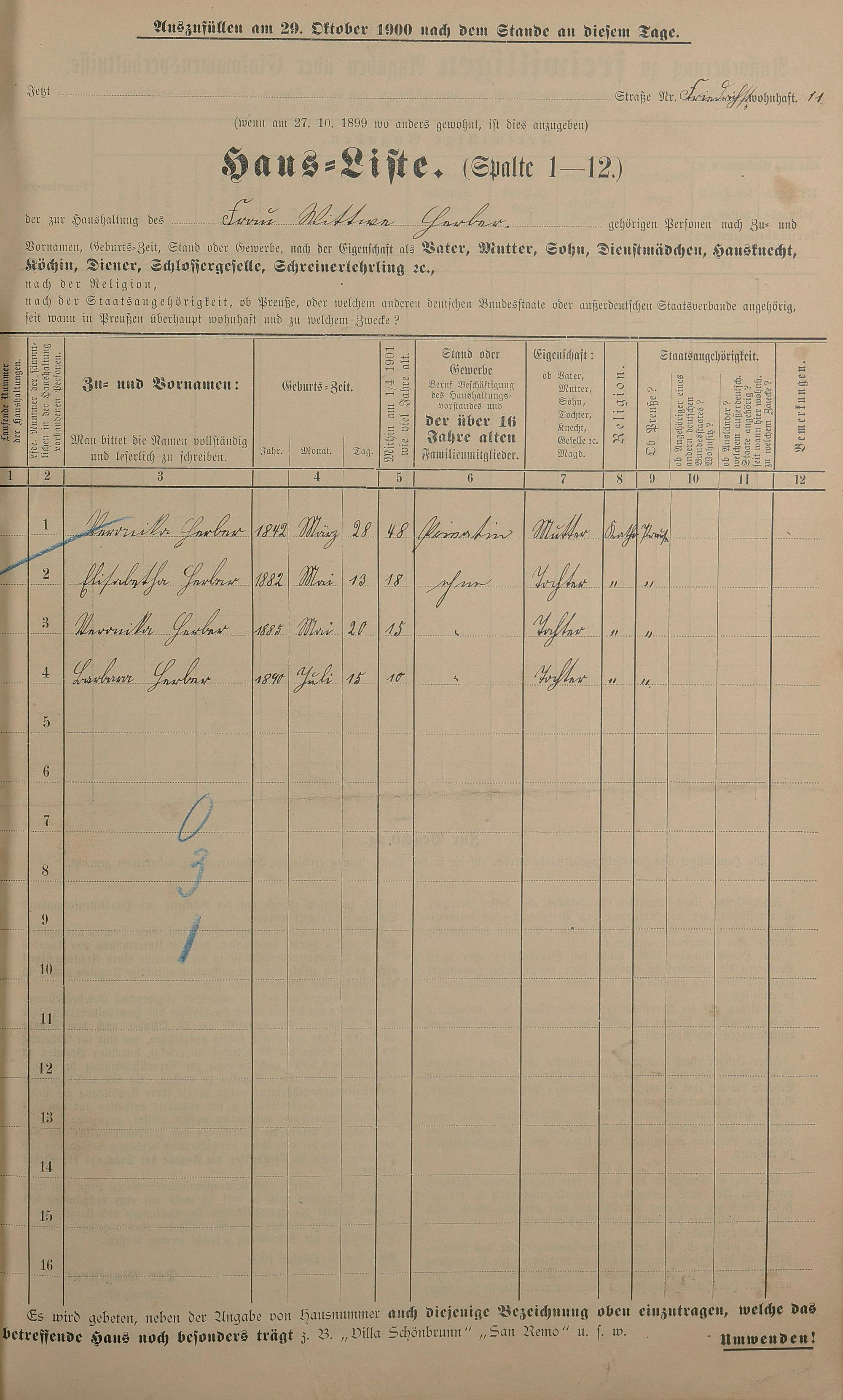 Personenstandsaufnahme zur Klassensteuerrolle für 1901