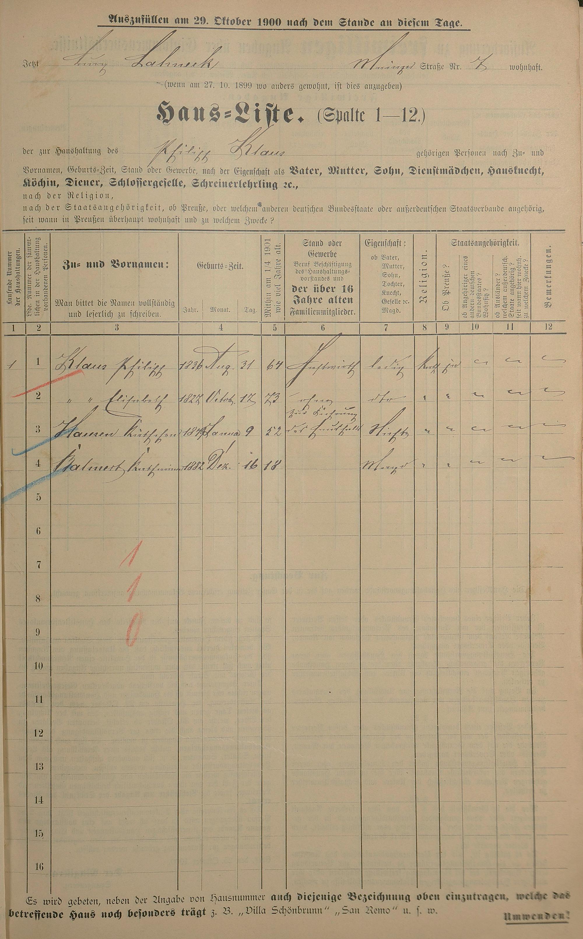 Personenstandsaufnahme zur Klassensteuerrolle für 1901