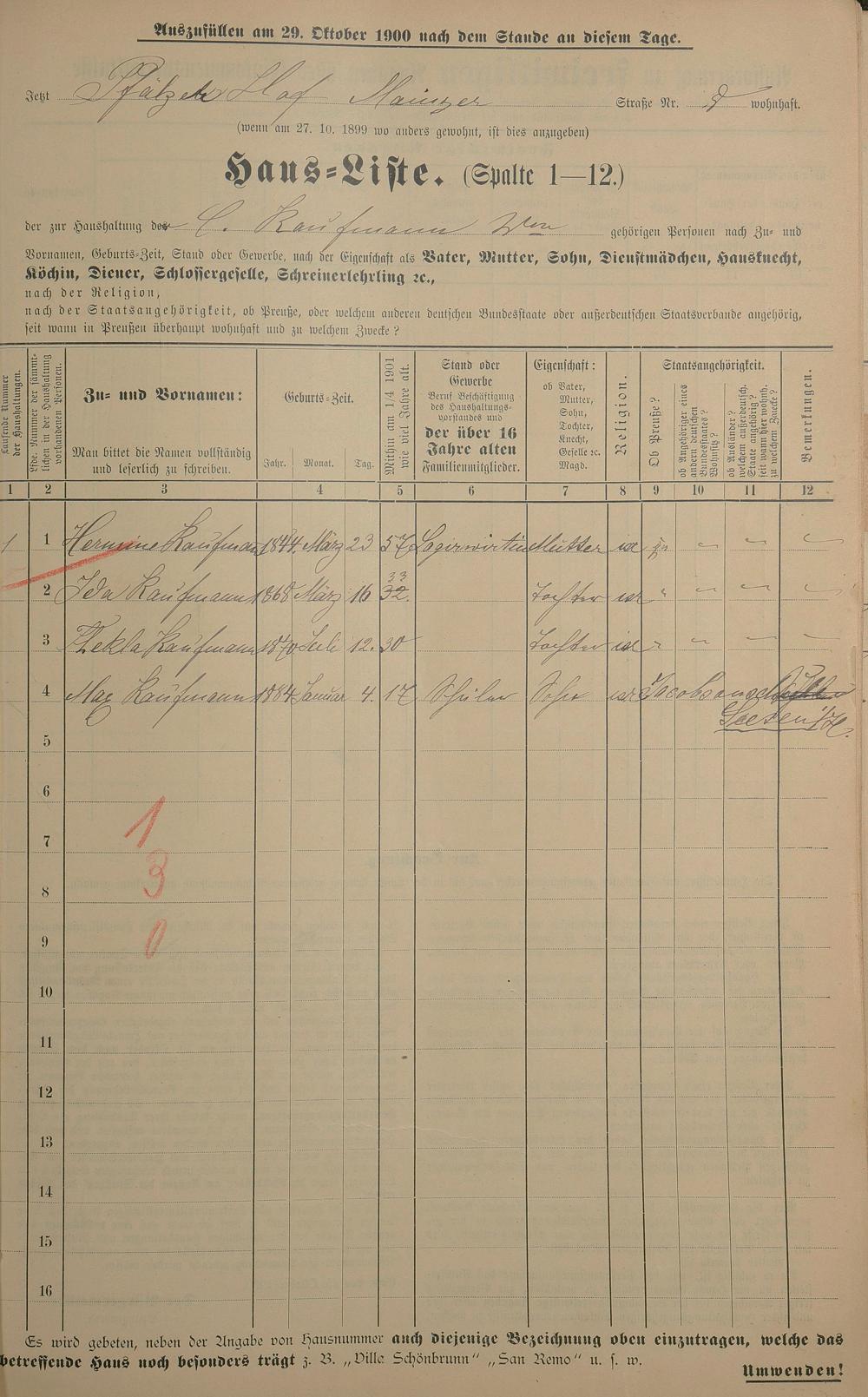 Personenstandsaufnahme zur Klassensteuerrolle für 1901