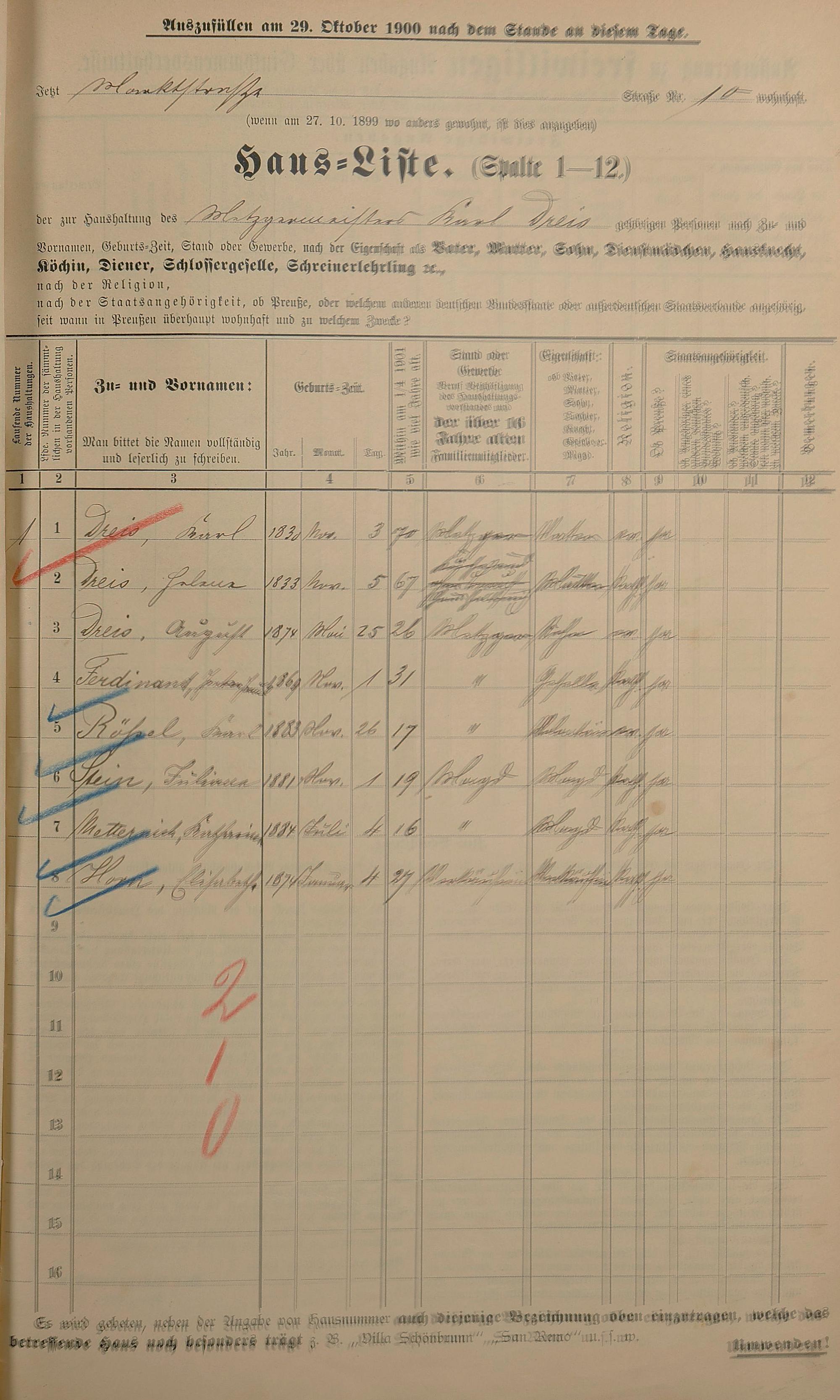Personenstandsaufnahme zur Klassensteuerrolle für 1901