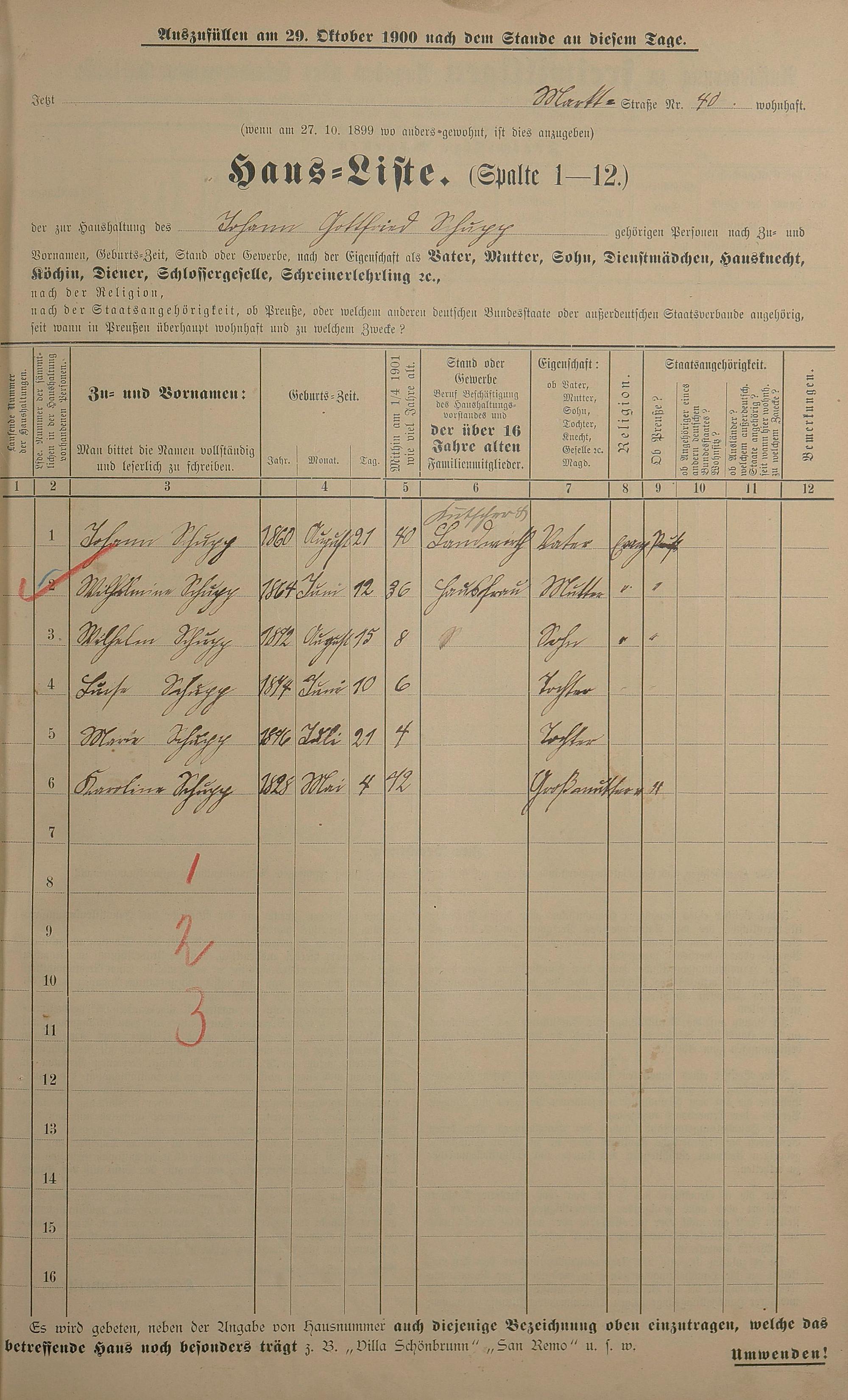 Personenstandsaufnahme zur Klassensteuerrolle für 1901