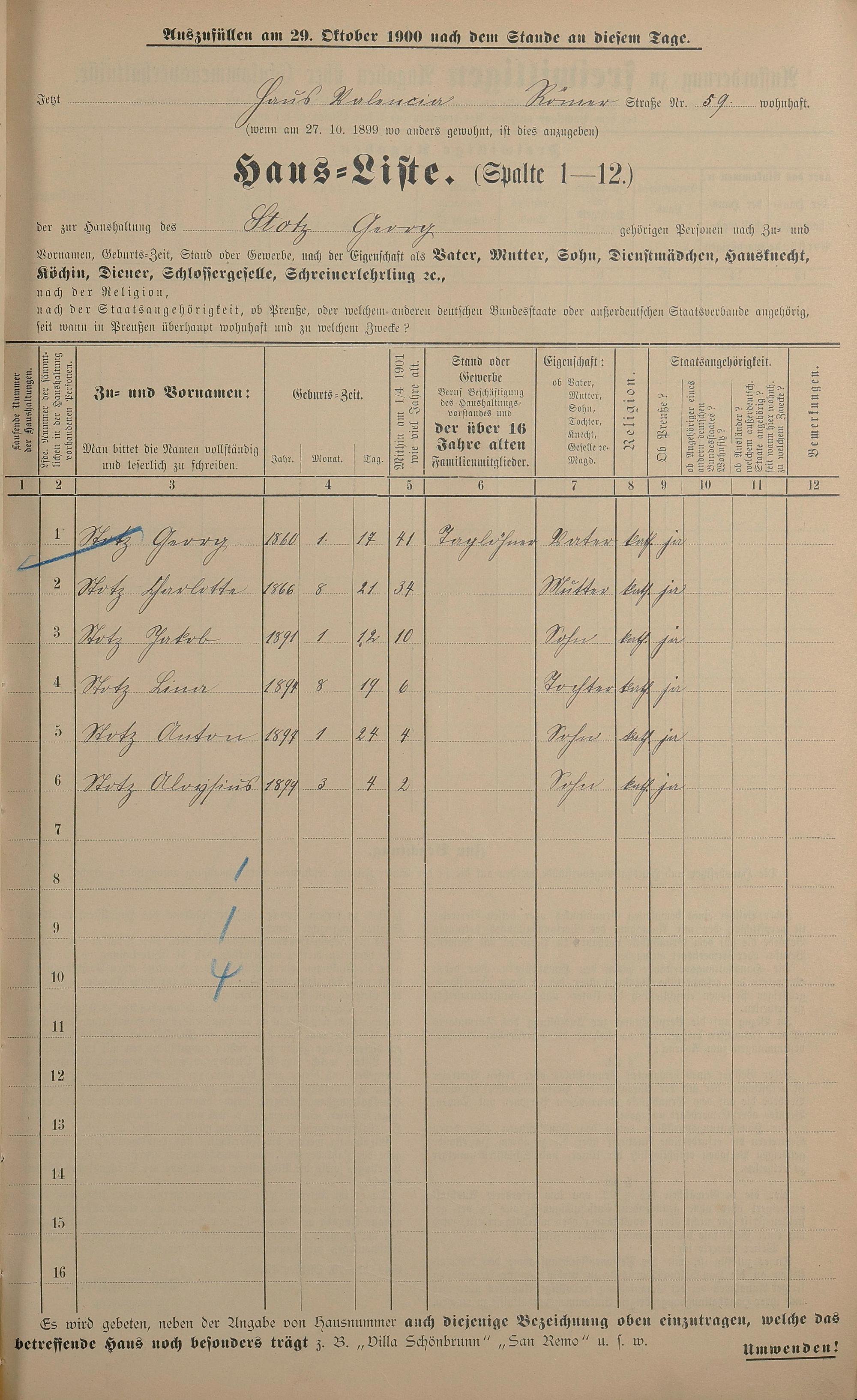 Personenstandsaufnahme zur Klassensteuerrolle für 1901