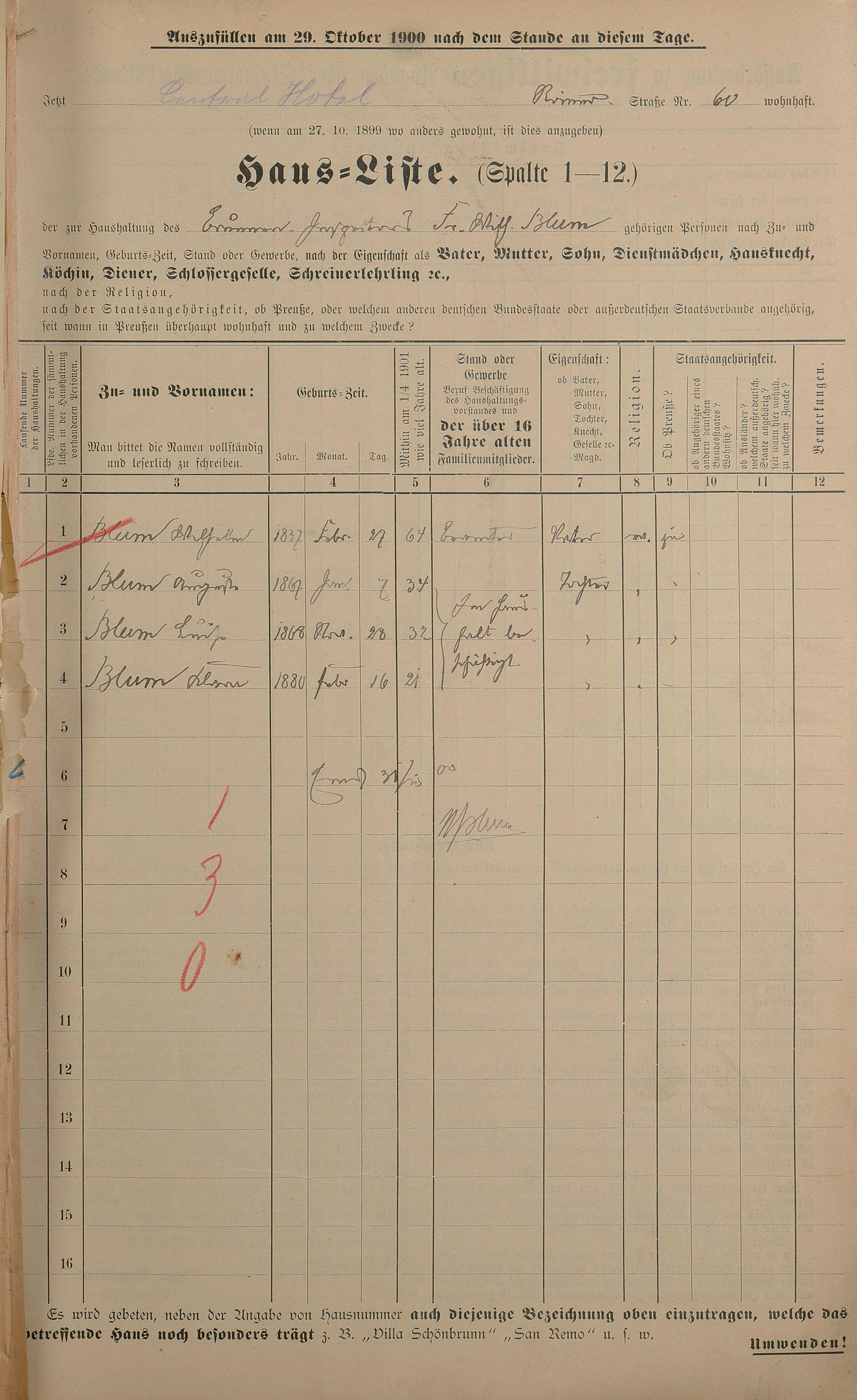 Personenstandsaufnahme zur Klassensteuerrolle für 1901