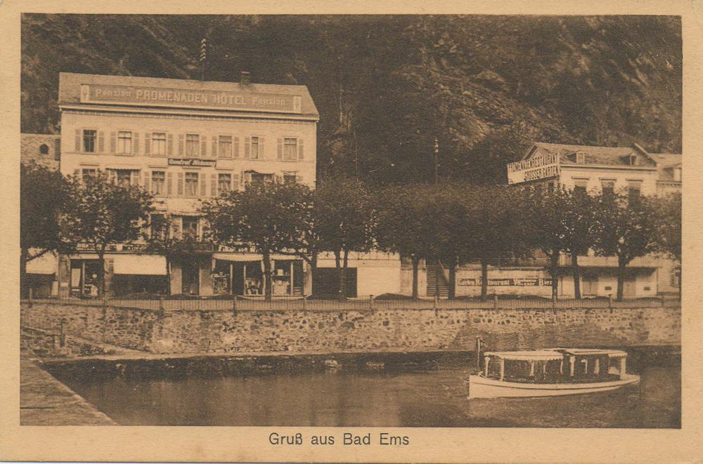 Hotel "Promenadenhotel" des Albert Ludwig Lahnstraße Nr. 11 - 12 mit Lahnpartie und Fahrgastschiff