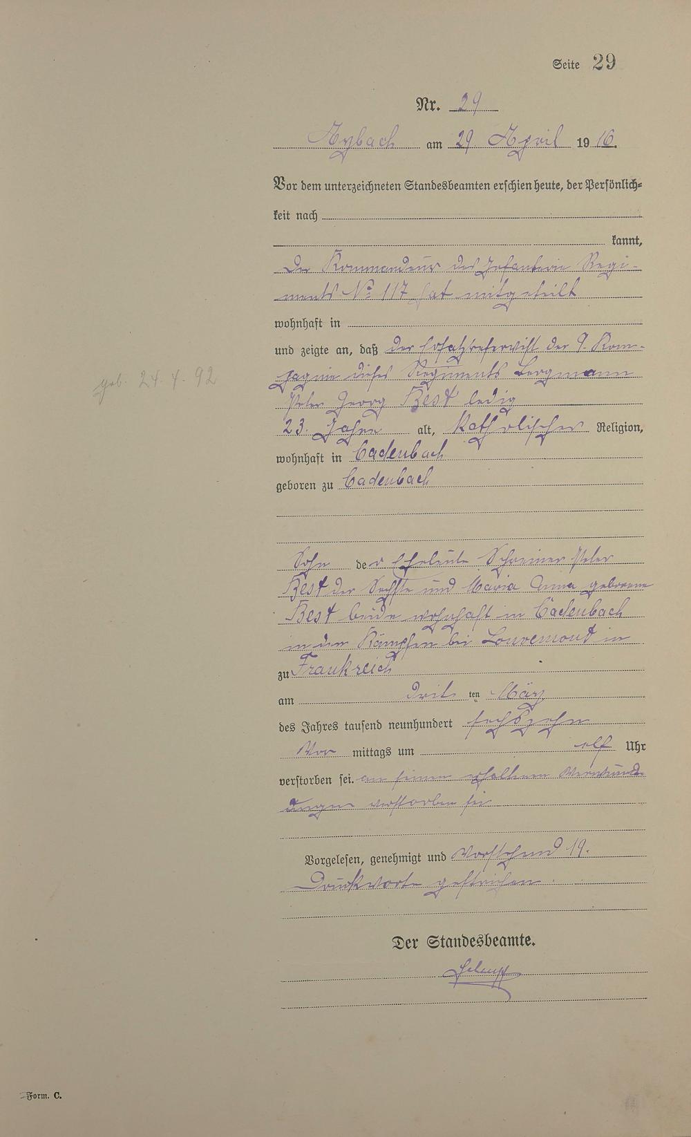 Sterberegister 1916