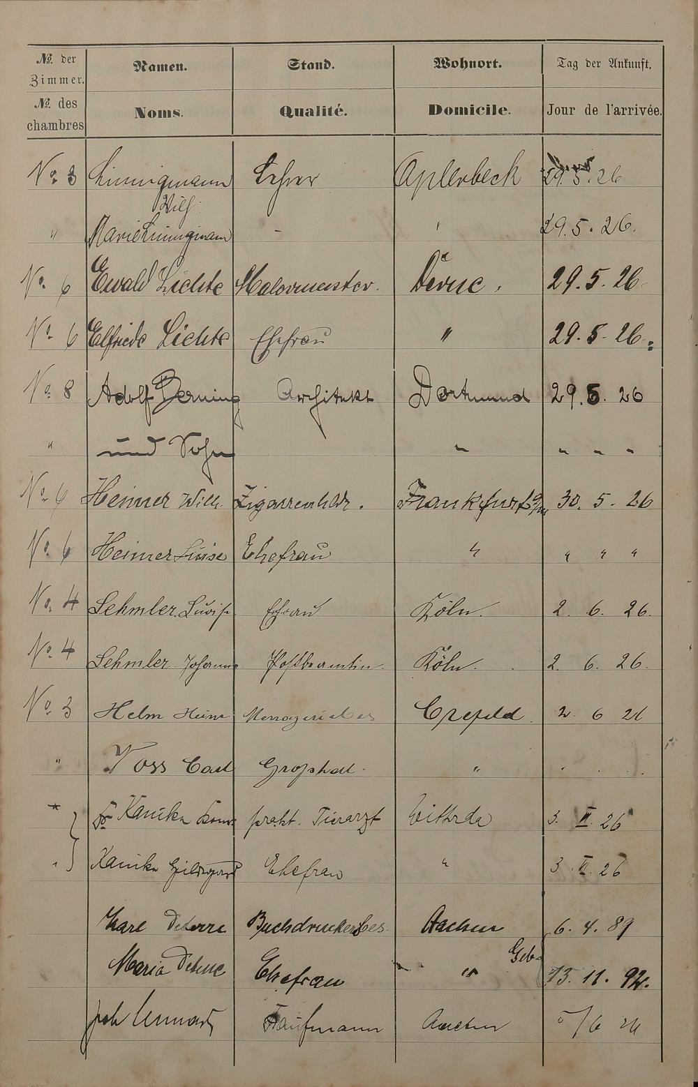 Pension "Badischer Hof" des Karl Unverzagt Lahnstraße Nr. 8 - Fremdenbuch 1889 - 13. Sept. 1893 und 15. Mai 1925 - 15. Okt. 1926