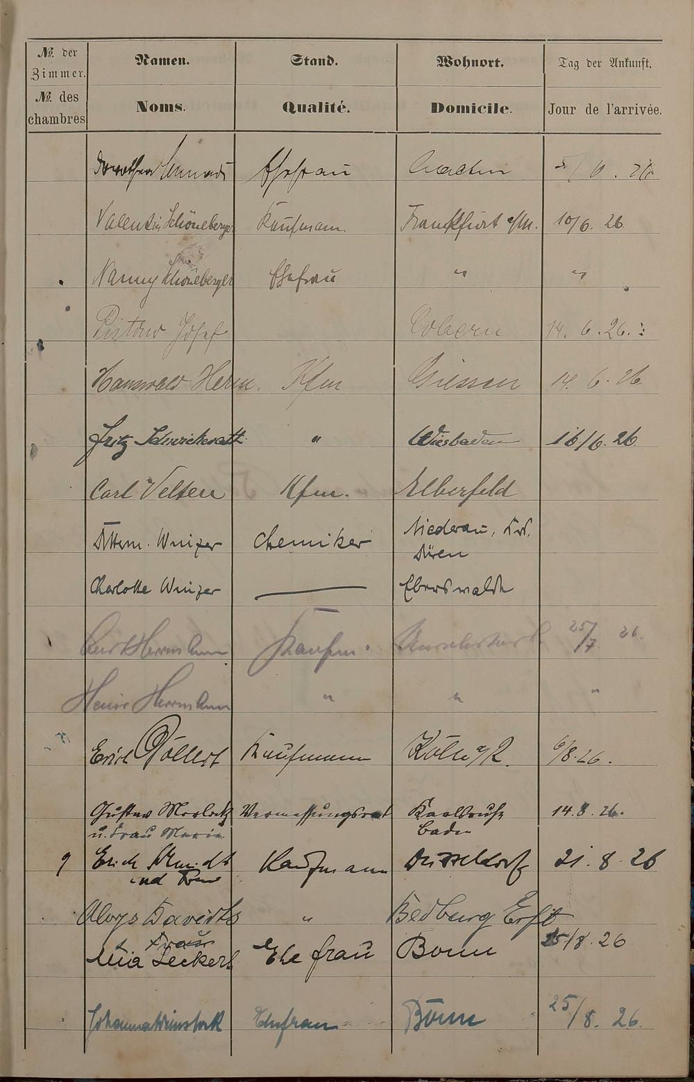 Pension "Badischer Hof" des Karl Unverzagt Lahnstraße Nr. 8 - Fremdenbuch 1889 - 13. Sept. 1893 und 15. Mai 1925 - 15. Okt. 1926
