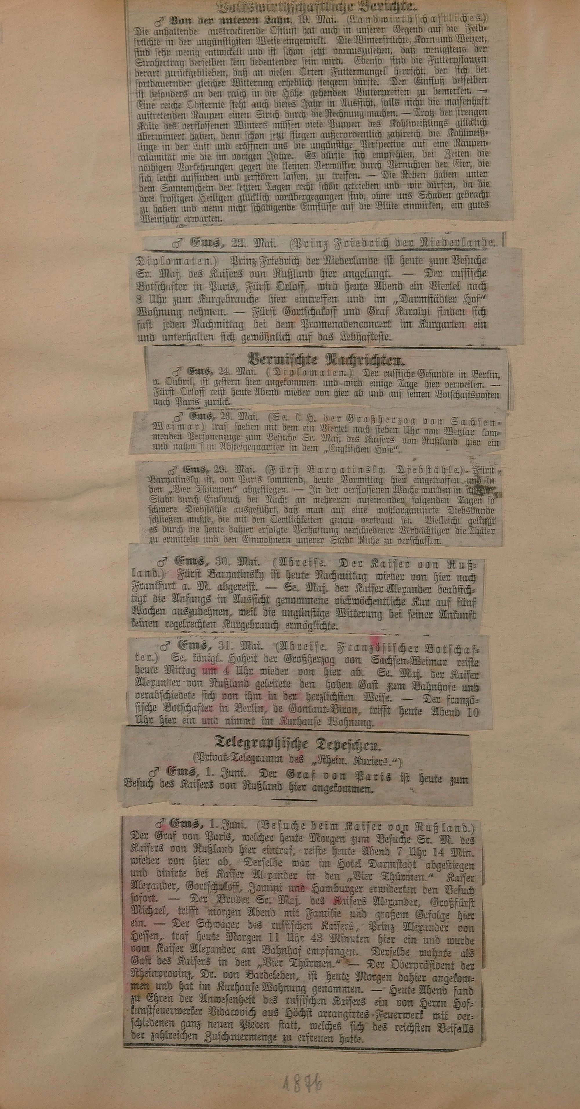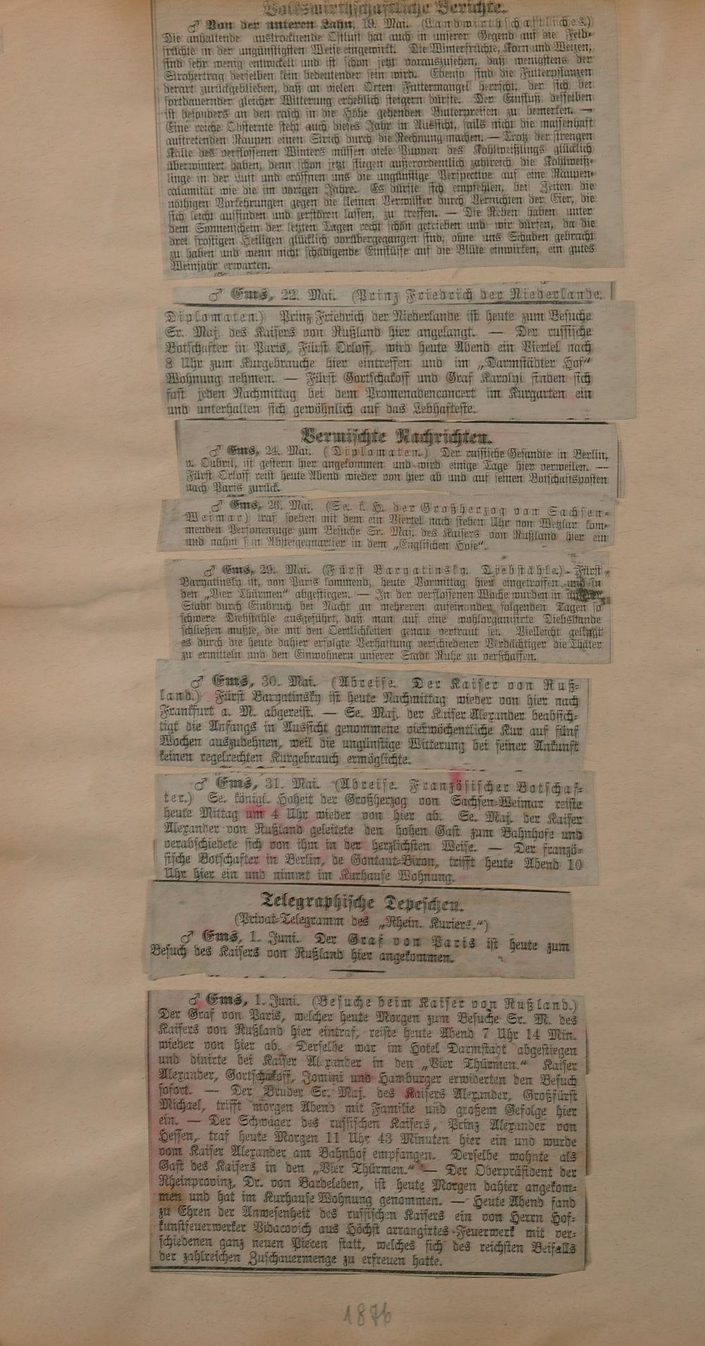 Sammlung von Artikeln des Korrespondenten Wilhelm Ebeling über Bad Ems im Wiesbadener "Rheinischen Kurier" aus den Jahren 1875-1878 und 1883-1898