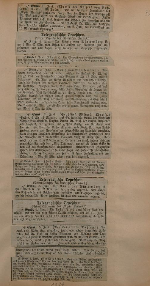 Sammlung von Artikeln des Korrespondenten Wilhelm Ebeling über Bad Ems im Wiesbadener "Rheinischen Kurier" aus den Jahren 1875-1878 und 1883-1898