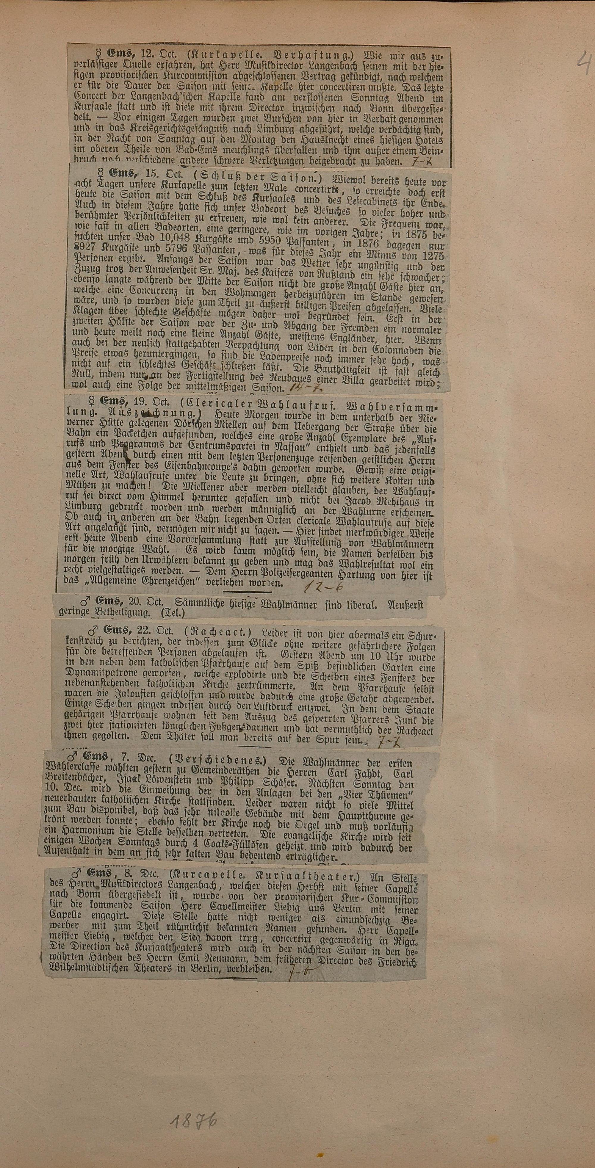 Sammlung von Artikeln des Korrespondenten Wilhelm Ebeling über Bad Ems im Wiesbadener "Rheinischen Kurier" aus den Jahren 1875-1878 und 1883-1898