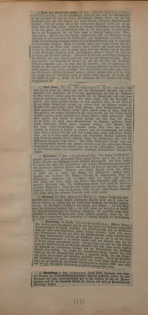 Sammlung von Artikeln des Korrespondenten Wilhelm Ebeling über Bad Ems im Wiesbadener "Rheinischen Kurier" aus den Jahren 1875-1878 und 1883-1898
