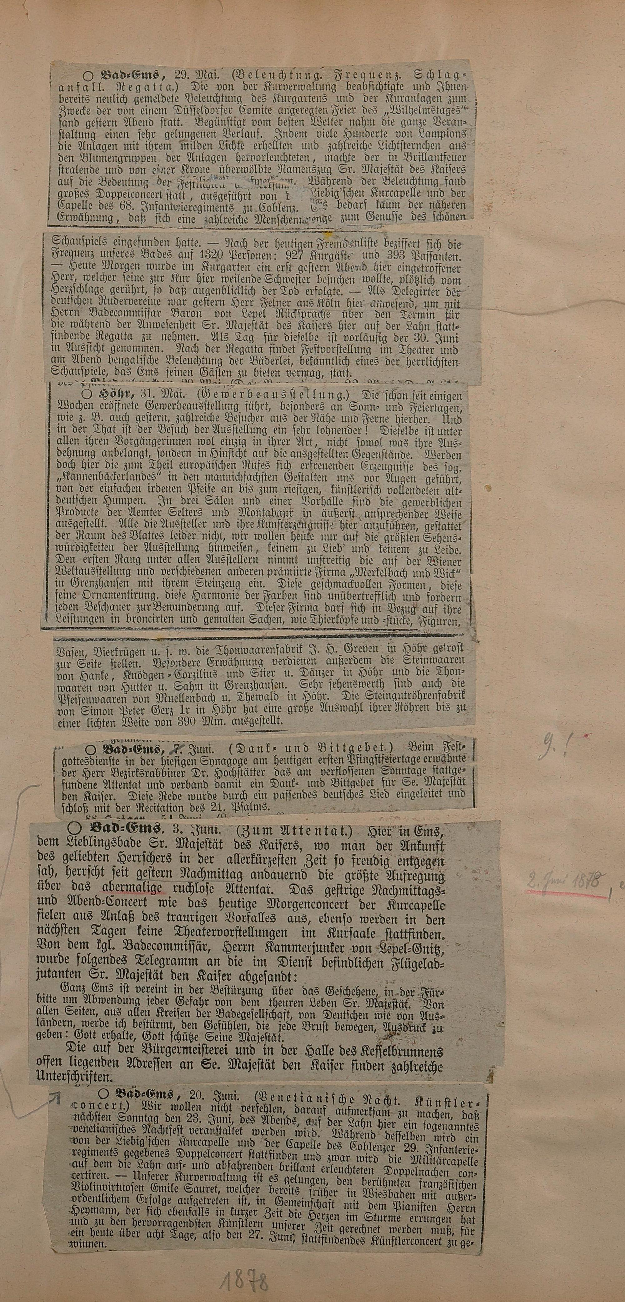 206: Sammlung von Artikeln des Korrespondenten Wilhelm Ebeling über Bad Ems im Wiesbadener...