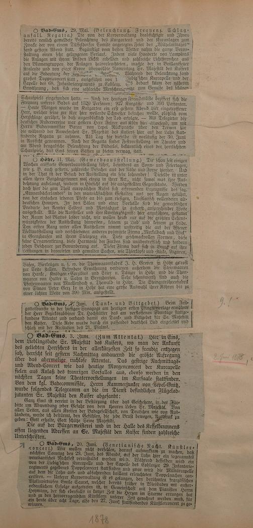 Sammlung von Artikeln des Korrespondenten Wilhelm Ebeling über Bad Ems im Wiesbadener "Rheinischen Kurier" aus den Jahren 1875-1878 und 1883-1898