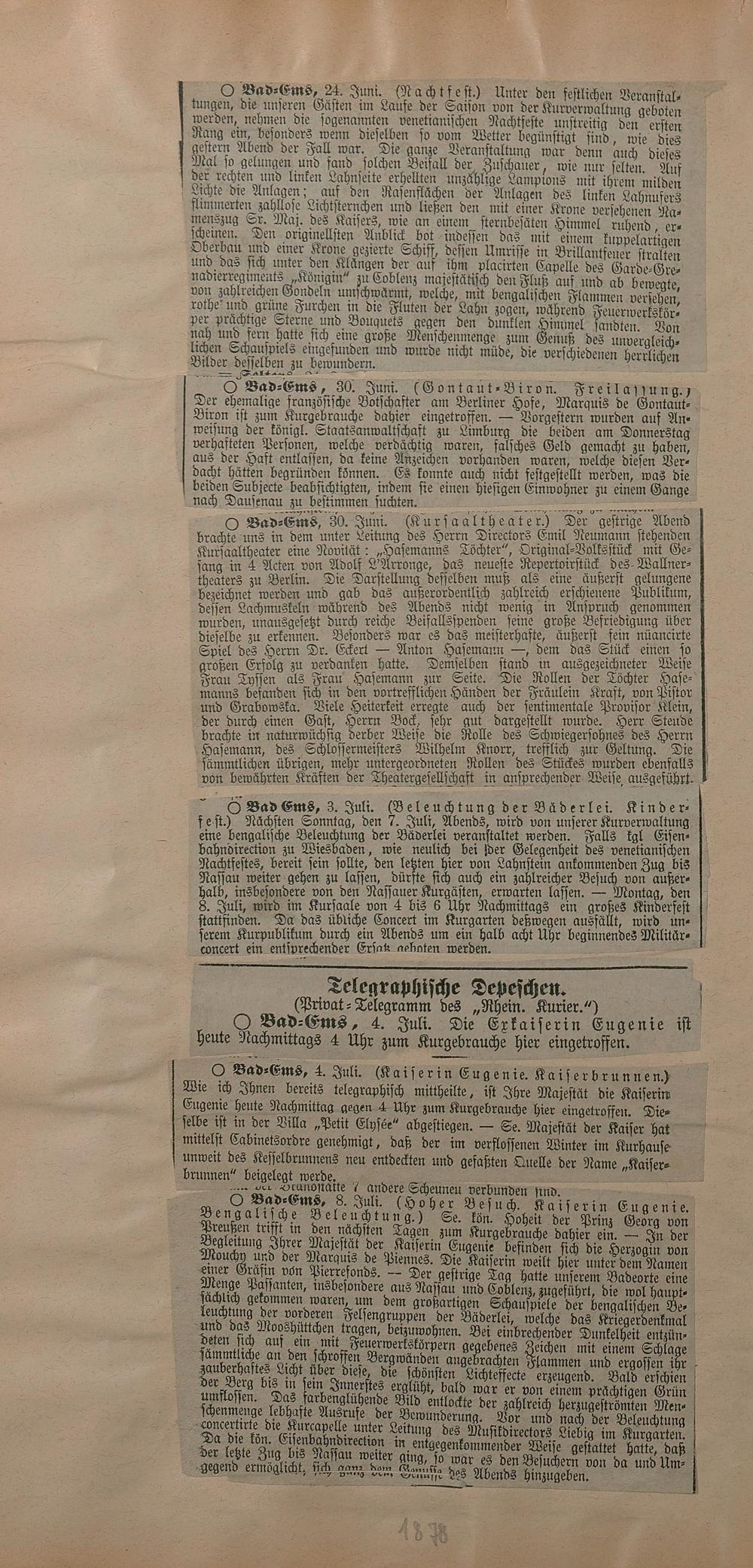 206: Sammlung von Artikeln des Korrespondenten Wilhelm Ebeling über Bad Ems im Wiesbadener...