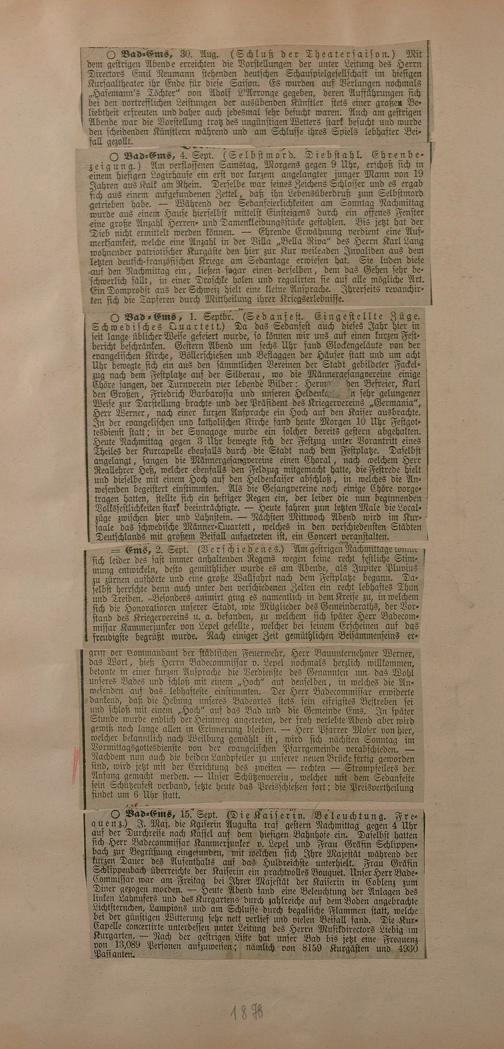Sammlung von Artikeln des Korrespondenten Wilhelm Ebeling über Bad Ems im Wiesbadener "Rheinischen Kurier" aus den Jahren 1875-1878 und 1883-1898
