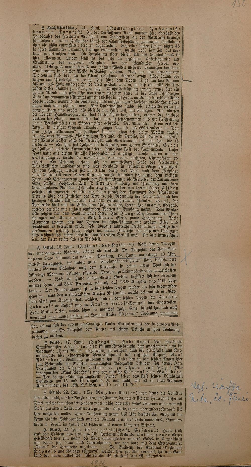 206: Sammlung von Artikeln des Korrespondenten Wilhelm Ebeling über Bad Ems im Wiesbadener...