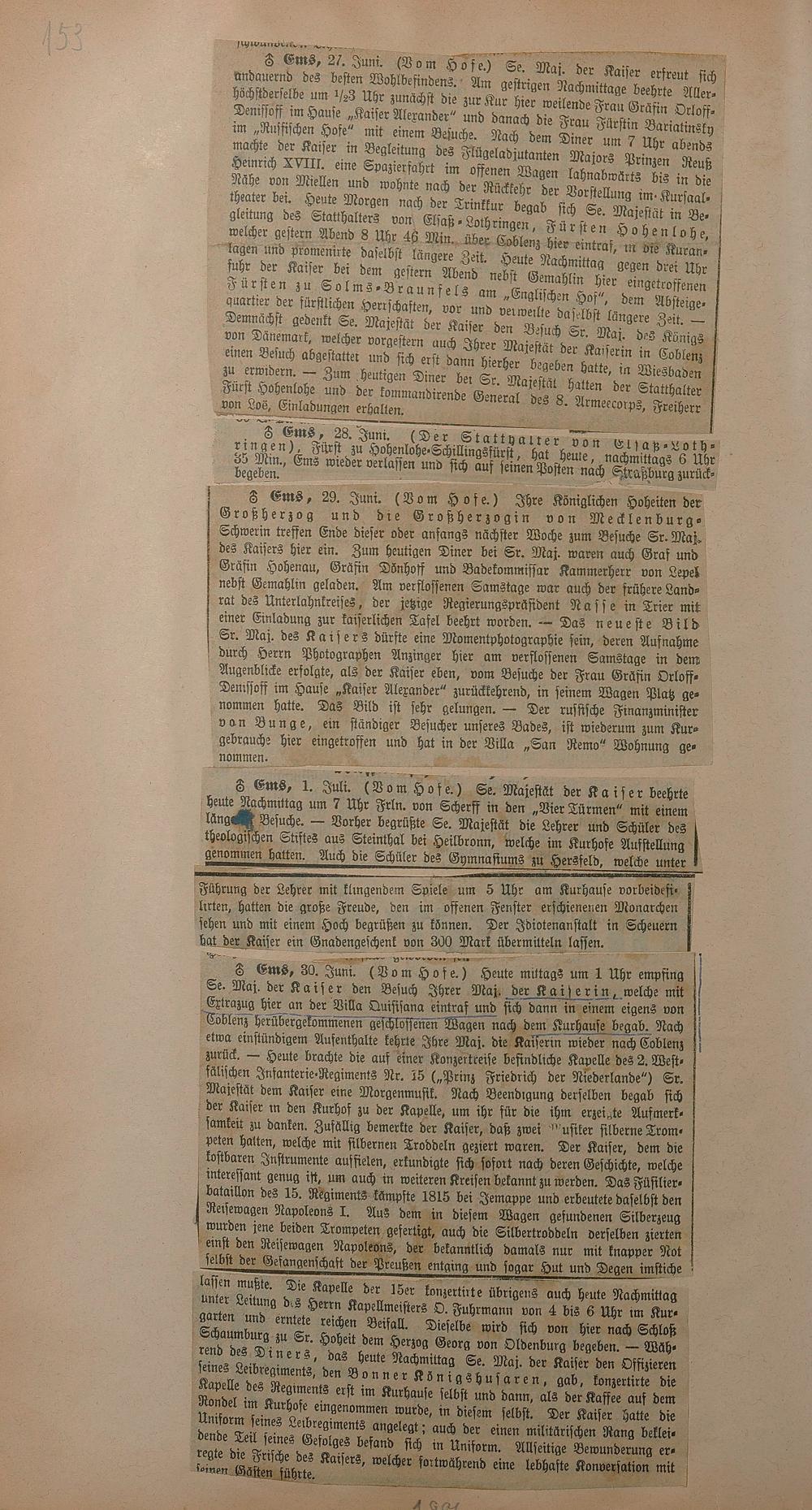 Sammlung von Artikeln des Korrespondenten Wilhelm Ebeling über Bad Ems im Wiesbadener "Rheinischen Kurier" aus den Jahren 1875-1878 und 1883-1898