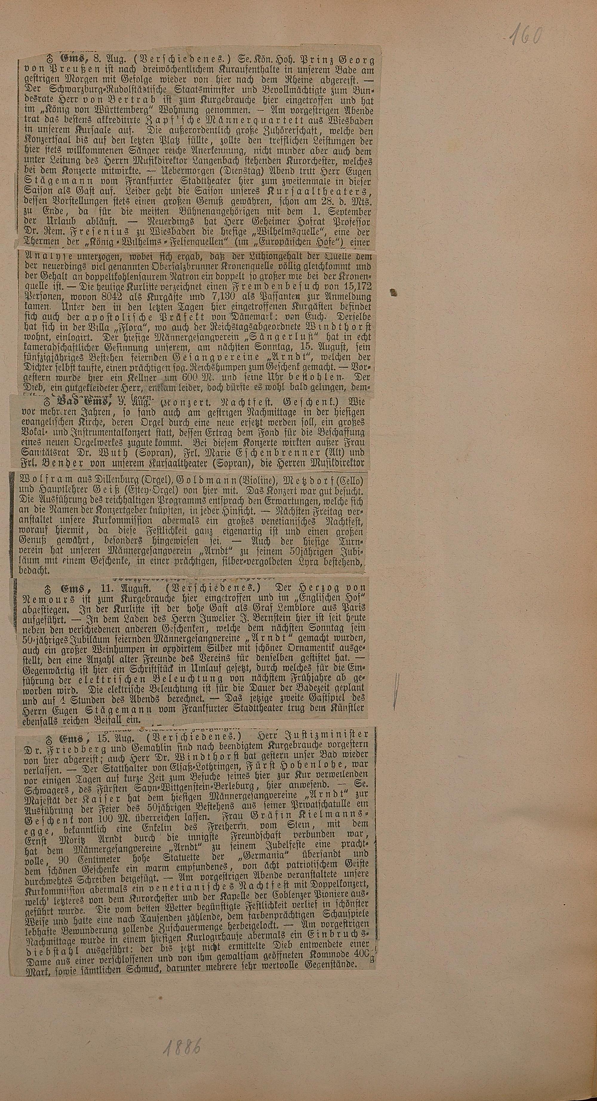 206: Sammlung von Artikeln des Korrespondenten Wilhelm Ebeling über Bad Ems im Wiesbadener...