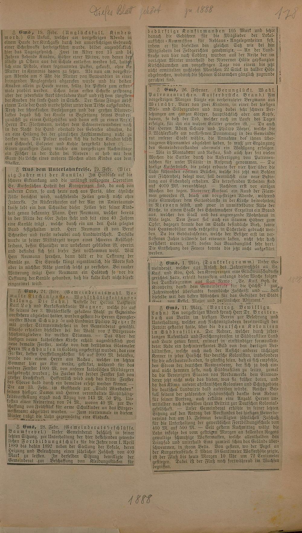 Sammlung von Artikeln des Korrespondenten Wilhelm Ebeling über Bad Ems im Wiesbadener "Rheinischen Kurier" aus den Jahren 1875-1878 und 1883-1898