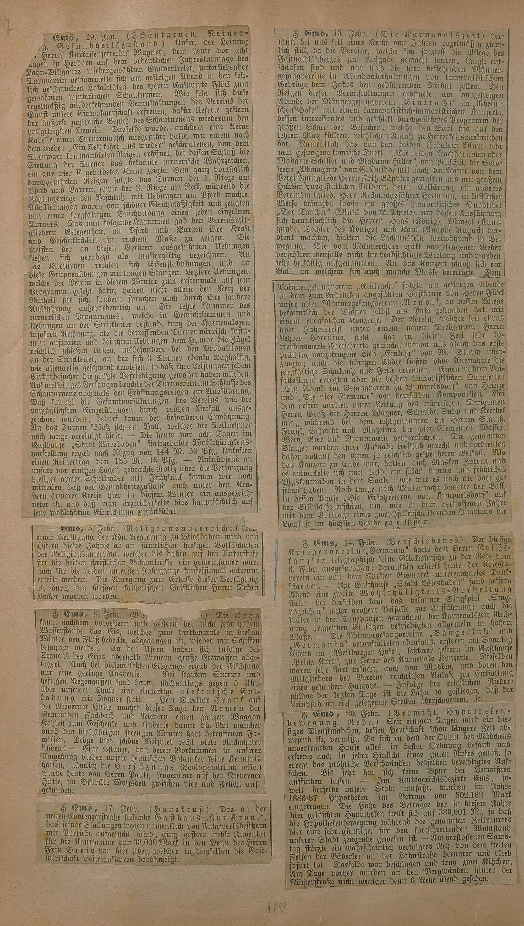 Sammlung von Artikeln des Korrespondenten Wilhelm Ebeling über Bad Ems im Wiesbadener "Rheinischen Kurier" aus den Jahren 1875-1878 und 1883-1898