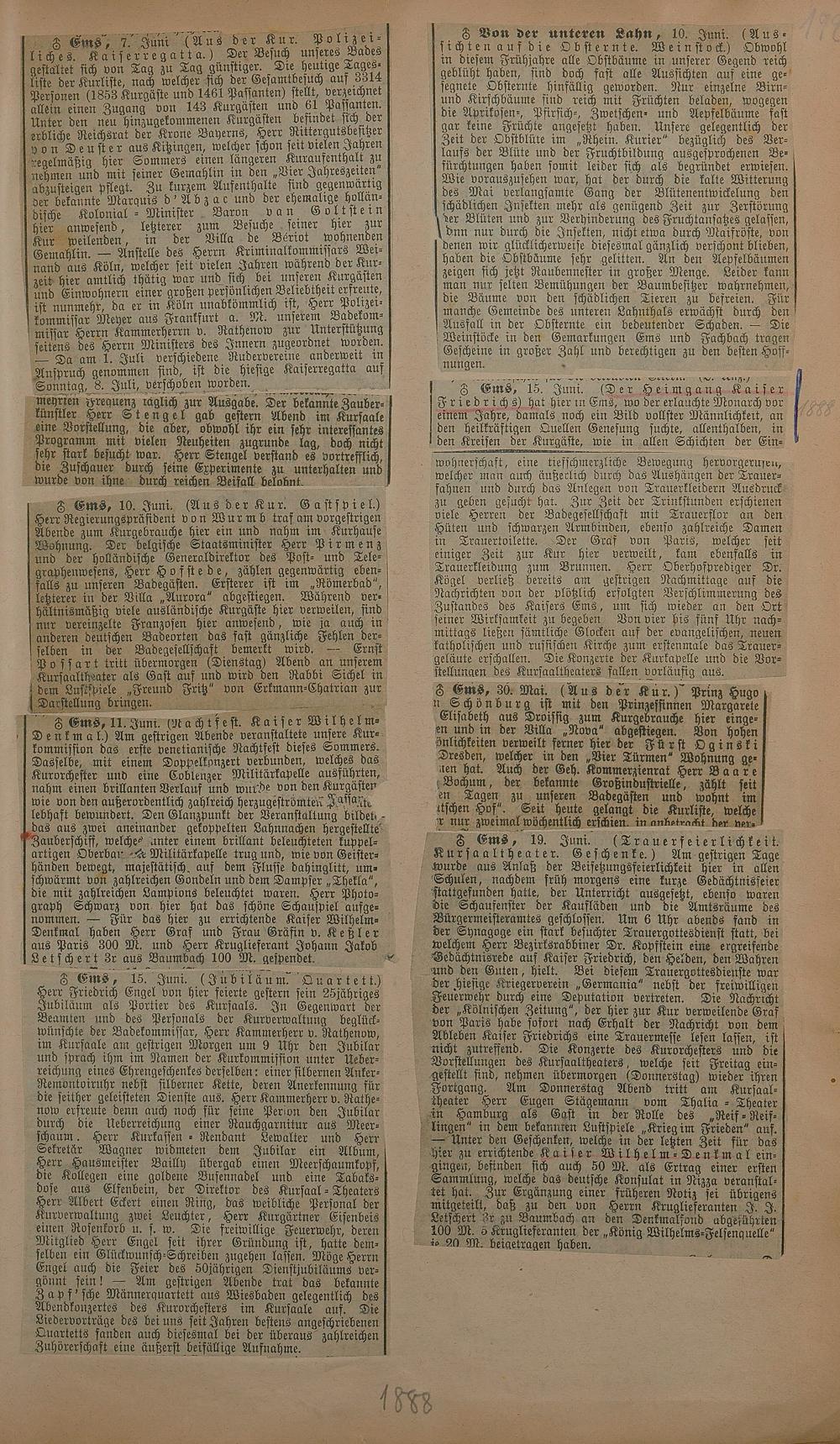 Sammlung von Artikeln des Korrespondenten Wilhelm Ebeling über Bad Ems im Wiesbadener "Rheinischen Kurier" aus den Jahren 1875-1878 und 1883-1898