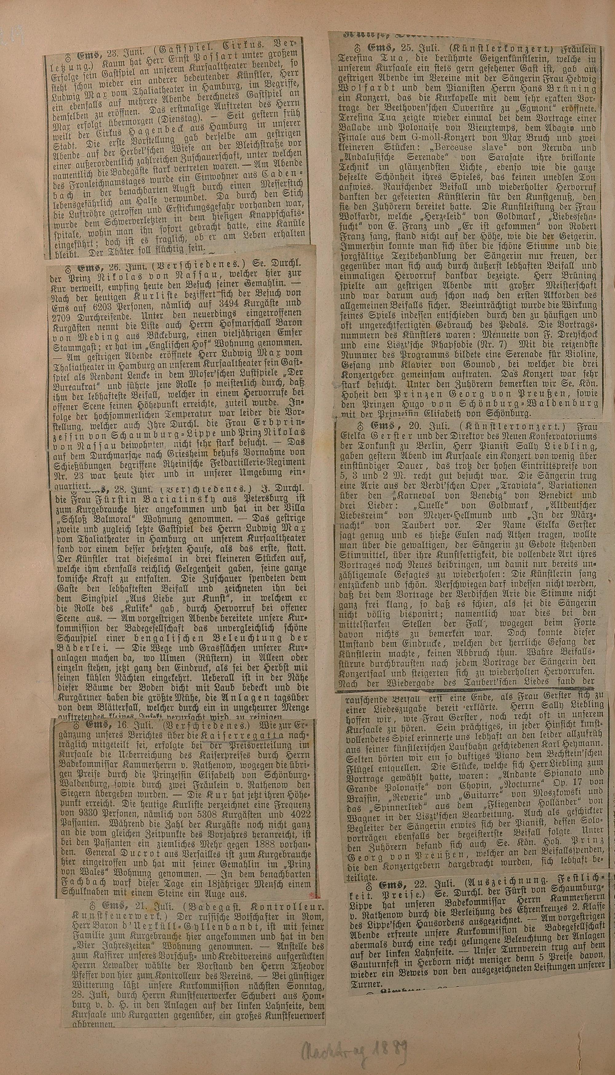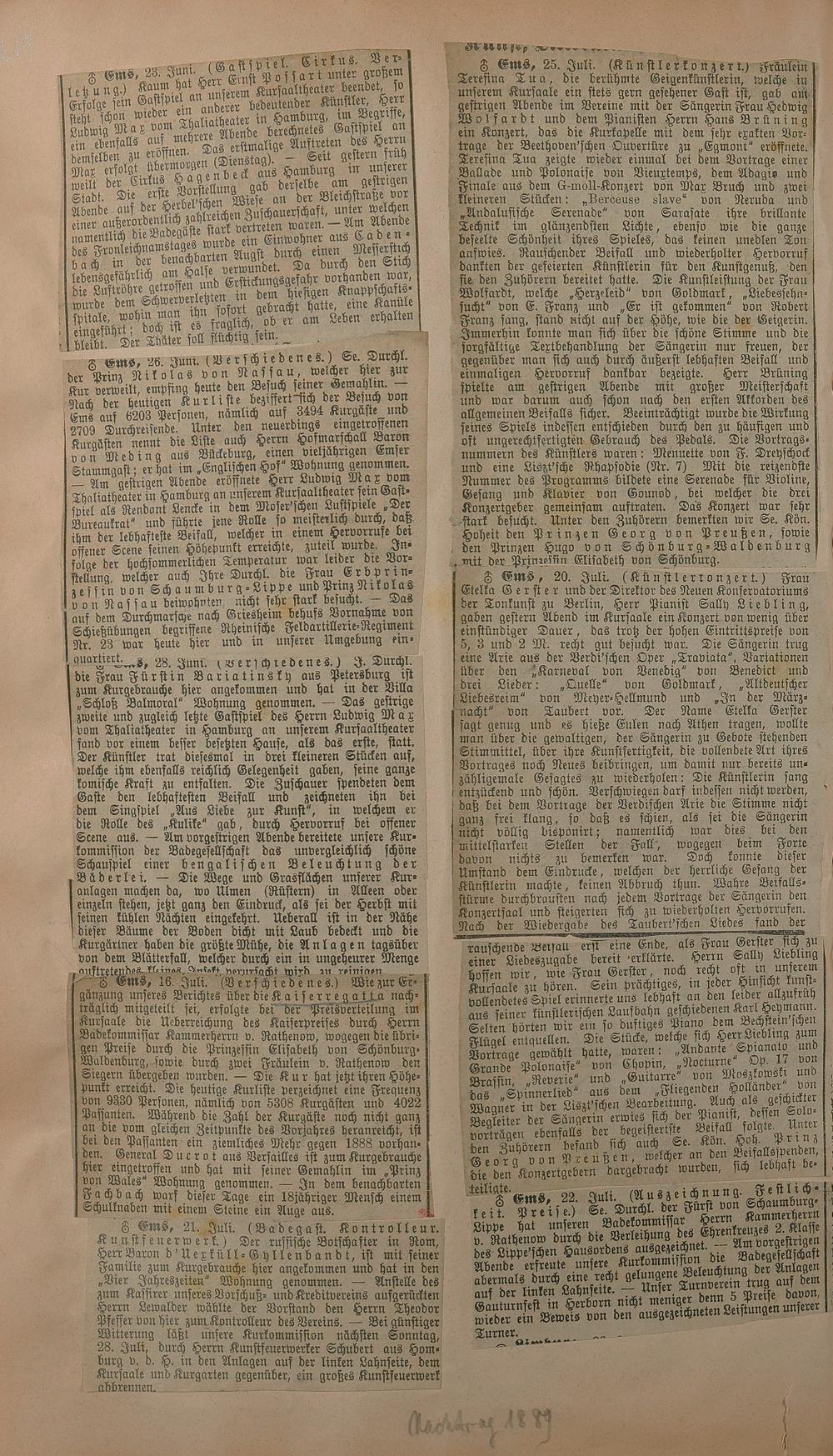 Sammlung von Artikeln des Korrespondenten Wilhelm Ebeling über Bad Ems im Wiesbadener "Rheinischen Kurier" aus den Jahren 1875-1878 und 1883-1898