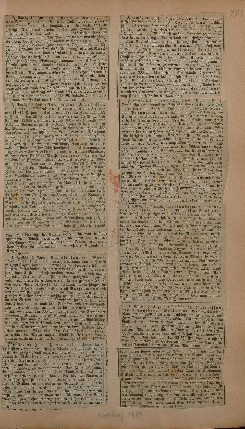 Sammlung von Artikeln des Korrespondenten Wilhelm Ebeling über Bad Ems im Wiesbadener "Rheinischen Kurier" aus den Jahren 1875-1878 und 1883-1898