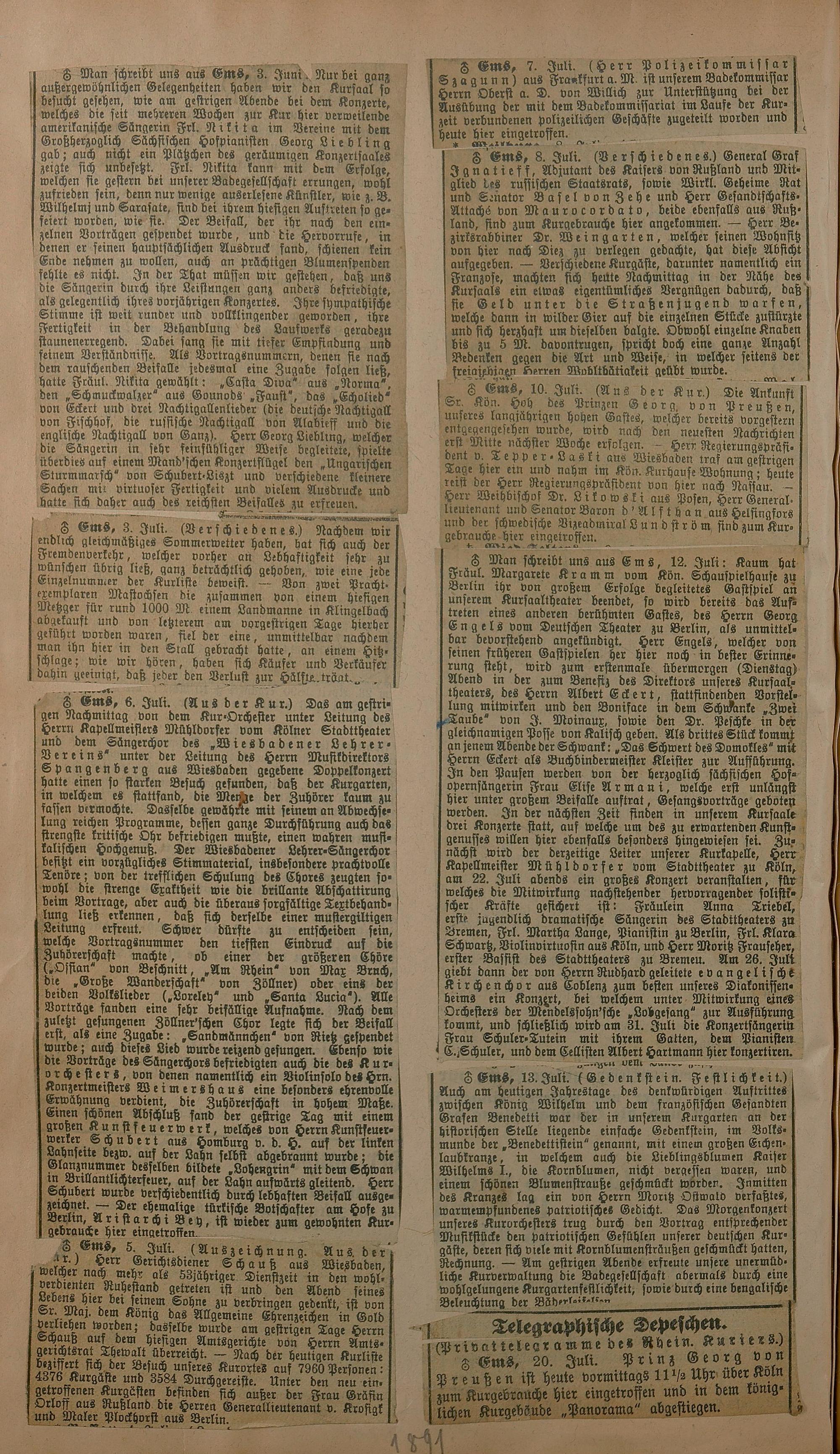 206: Sammlung von Artikeln des Korrespondenten Wilhelm Ebeling über Bad Ems im Wiesbadener...