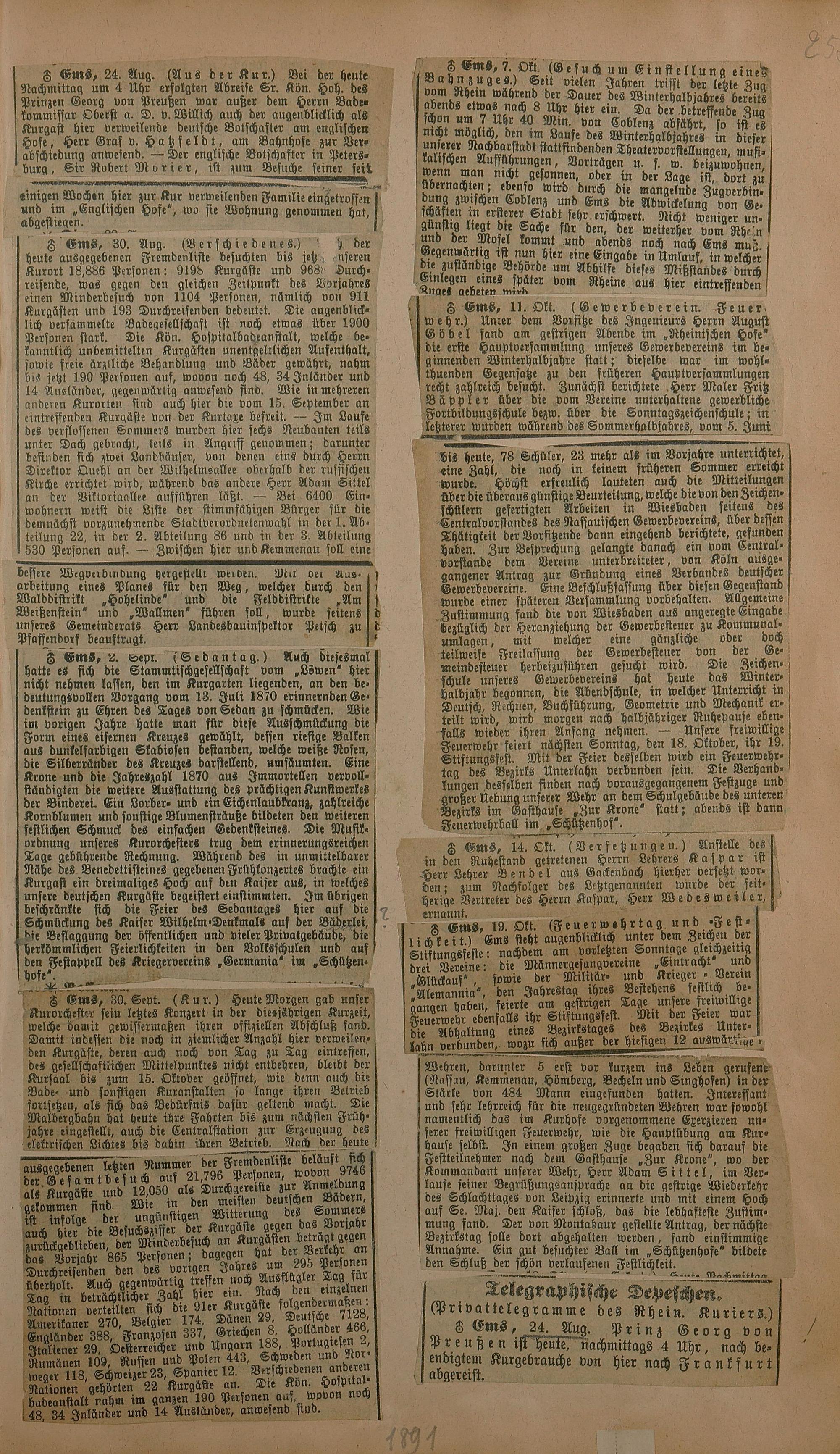 206: Sammlung von Artikeln des Korrespondenten Wilhelm Ebeling über Bad Ems im Wiesbadener...
