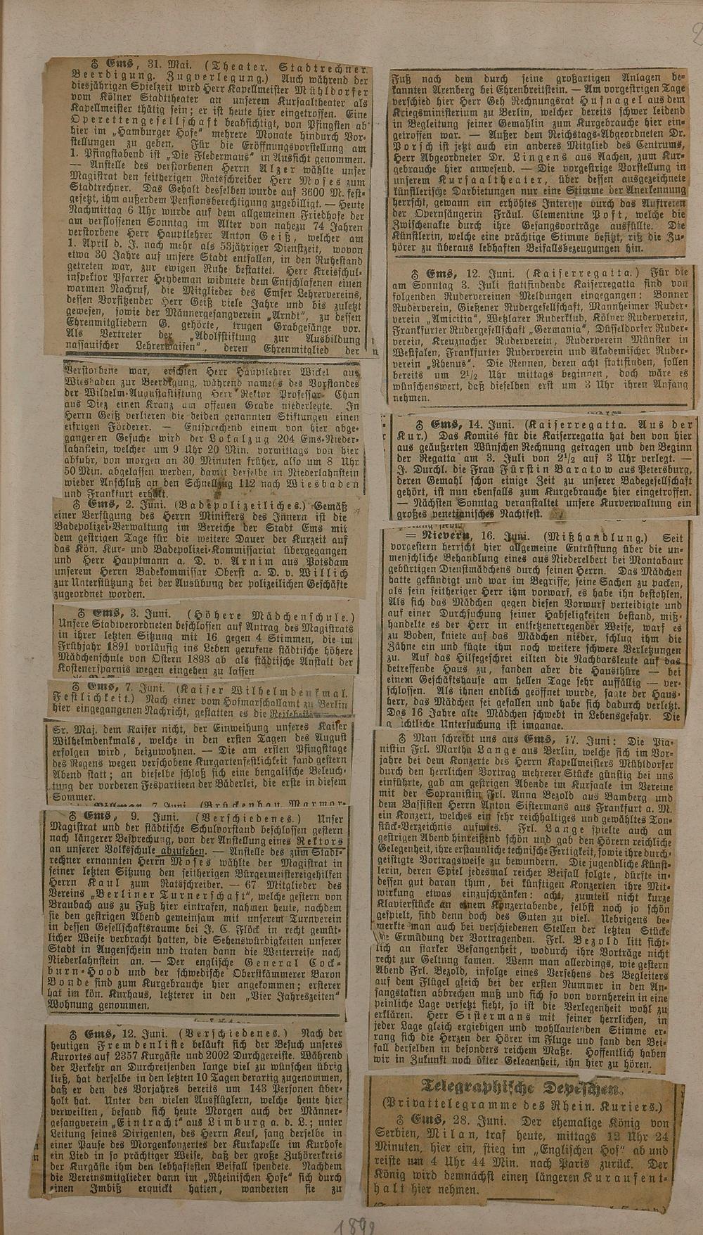 Sammlung von Artikeln des Korrespondenten Wilhelm Ebeling über Bad Ems im Wiesbadener "Rheinischen Kurier" aus den Jahren 1875-1878 und 1883-1898