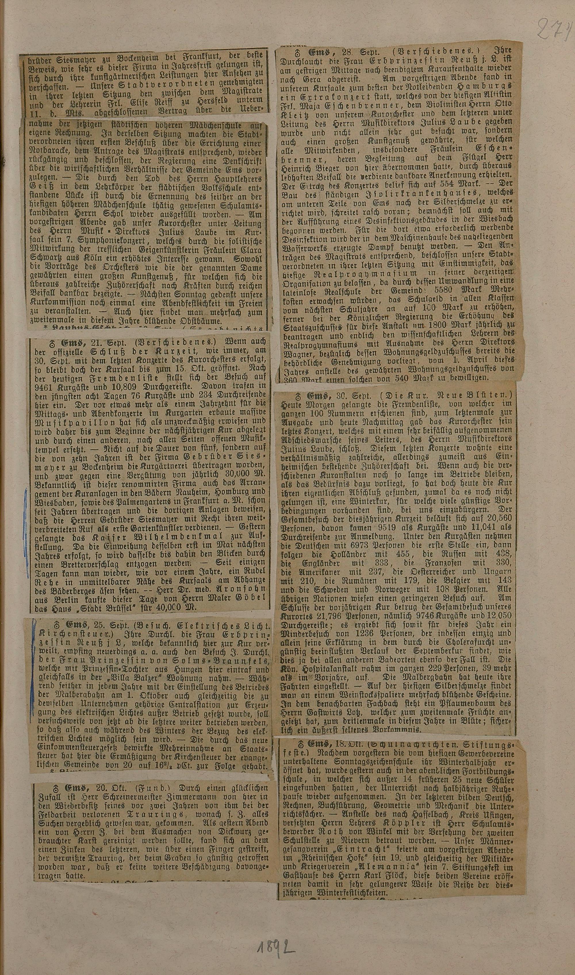 206: Sammlung von Artikeln des Korrespondenten Wilhelm Ebeling über Bad Ems im Wiesbadener...