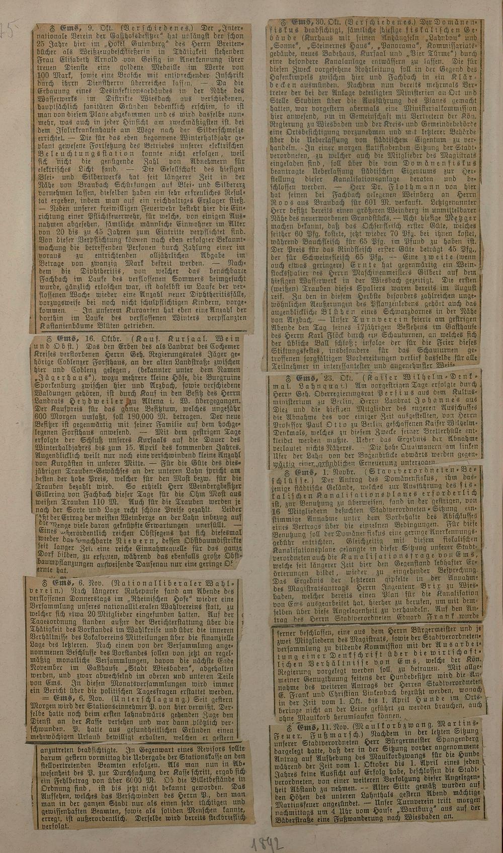 Sammlung von Artikeln des Korrespondenten Wilhelm Ebeling über Bad Ems im Wiesbadener "Rheinischen Kurier" aus den Jahren 1875-1878 und 1883-1898