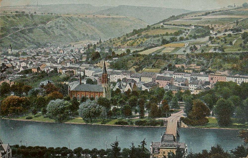 Total von Süden mit Kaiserbrücke, Katholischer St. Martin Kirche, Römerstraße und Dorf Ems