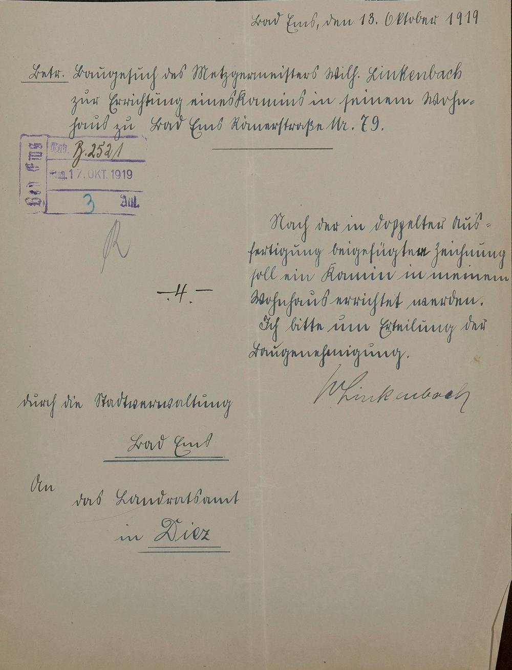 Bauangelegenheiten des Hauses "Zur Eisenbahn" des Witwe Karl Linkenbach/Wilhelm Linkenbach/Lina Linkenbach geb. Heck/Werner Linkenbach/Helge Dadder Bad Ems Römerstraße Nr. 79 (74) (An der Brück) Flur 98 Nr. 52 (522/150)