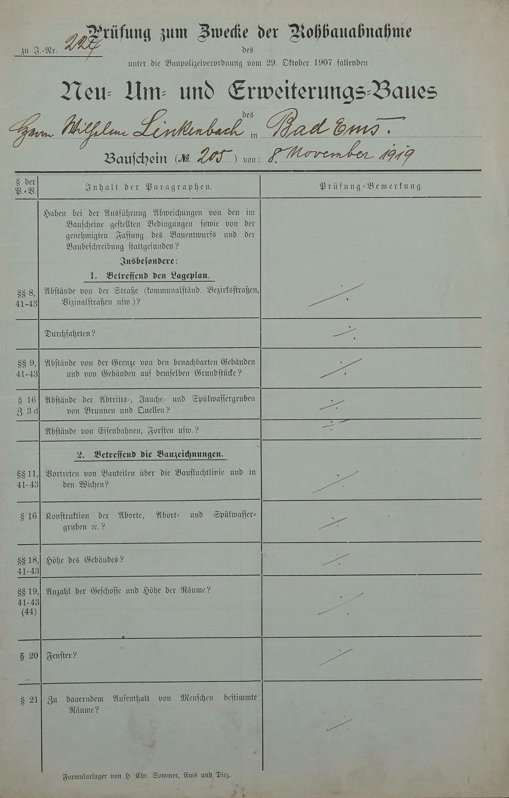 Bauangelegenheiten des Hauses "Zur Eisenbahn" des Witwe Karl Linkenbach/Wilhelm Linkenbach/Lina Linkenbach geb. Heck/Werner Linkenbach/Helge Dadder Bad Ems Römerstraße Nr. 79 (74) (An der Brück) Flur 98 Nr. 52 (522/150)