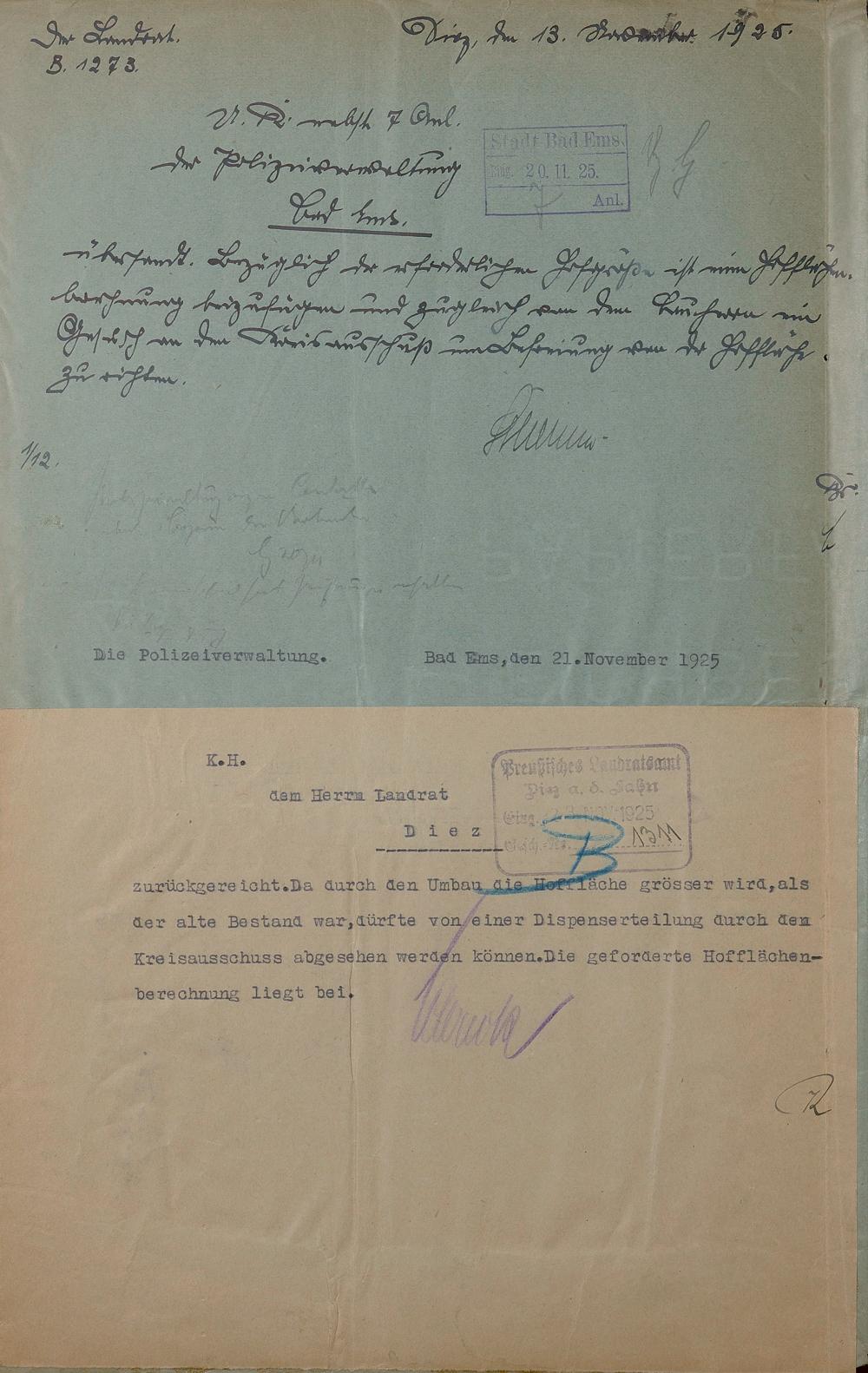 Bauangelegenheiten des Hauses "Zur Eisenbahn" des Witwe Karl Linkenbach/Wilhelm Linkenbach/Lina Linkenbach geb. Heck/Werner Linkenbach/Helge Dadder Bad Ems Römerstraße Nr. 79 (74) (An der Brück) Flur 98 Nr. 52 (522/150)