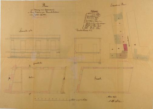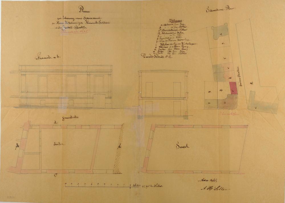 Speisesaal des Hotels "Soltau" des Asmus Heinrich Soltau/Karl Friedrich Heinrich Becker/Nassauische Landesbank/Reichsarbeitsdienst/Nassauische Sparkasse Bad Ems Römerstraße Nr. 91 (65, 86) Flur 92 Nr. 59 - Ansicht, Schnitt, Grundrisse und Lageplan
